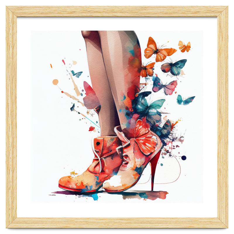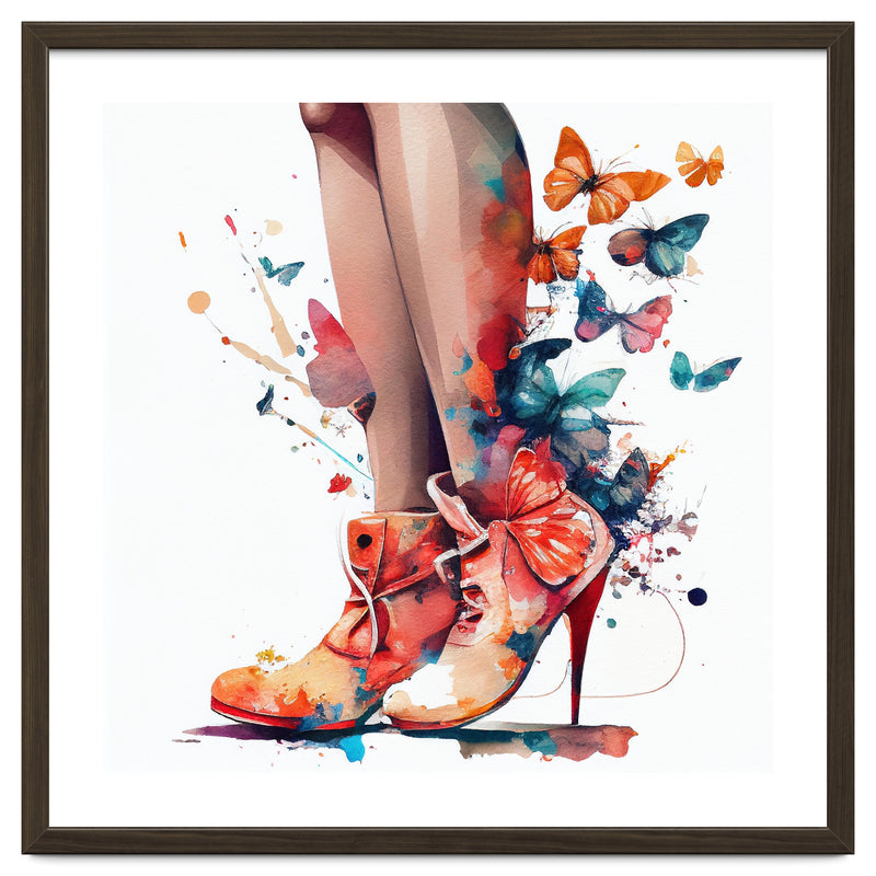 Close up watercolor composition focused on legs and high heels as a burst of butterflies lifts from the ankles. Open negative space keeps the silhouette crisp while transparent washes and controlled splashes suggest motion. Coral and turquoise passages add a lively accent, creating a clean contemporary focal point for modern interiors.