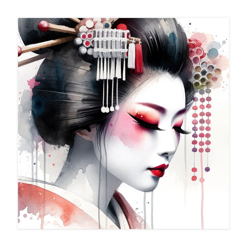 Close up watercolor portrait of a modern geisha in serene side view. Porcelain skin with crimson and rose makeup, a refined kanzashi comb and tassels in a neat hair bun, and beaded ornaments beside the face. Transparent washes and clean negative space keep the contour crisp at large scale for elegant contemporary interiors.