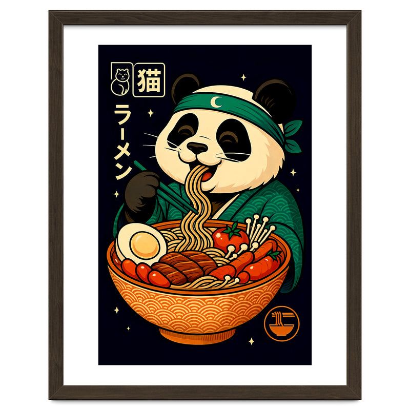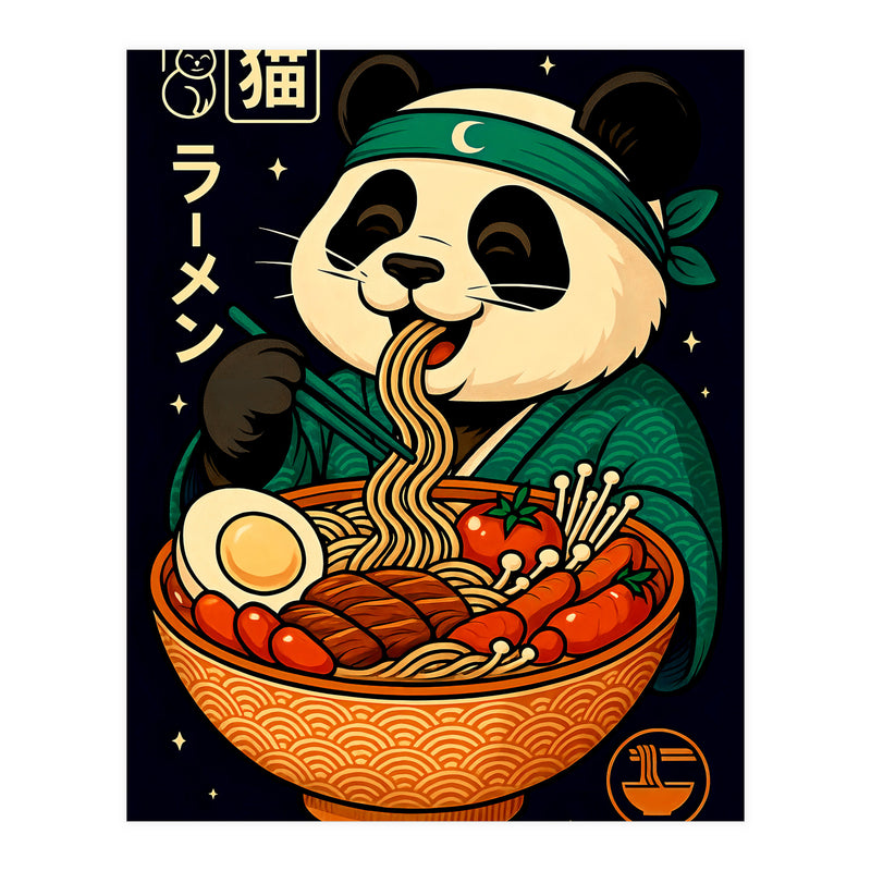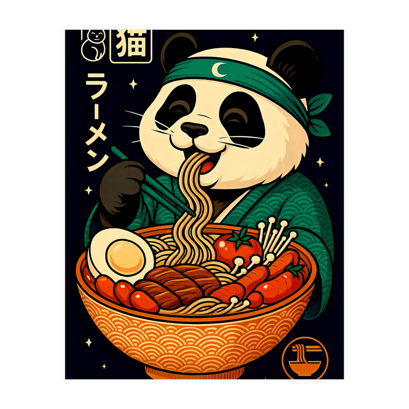 Panda Ramen" A calming and delightful illustration that blends the relaxed charm of the panda with the unrivaled deliciousness of a classic Japanese ramen bowl.