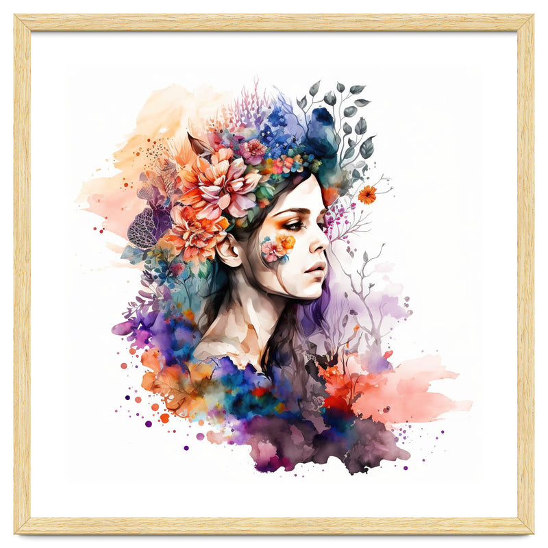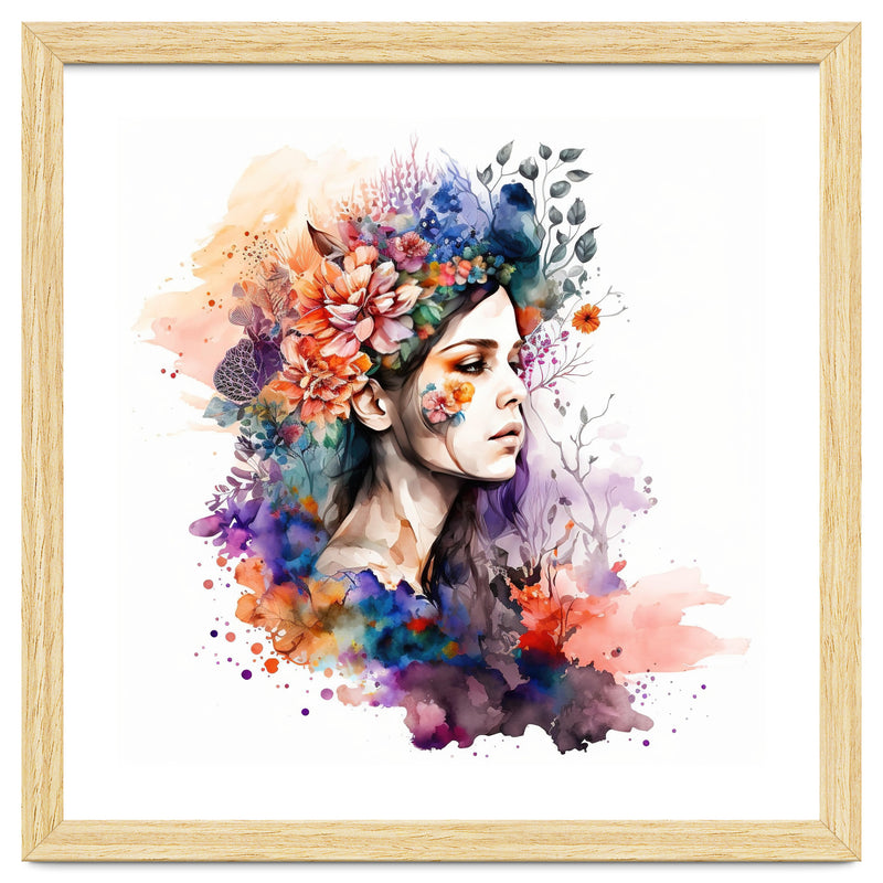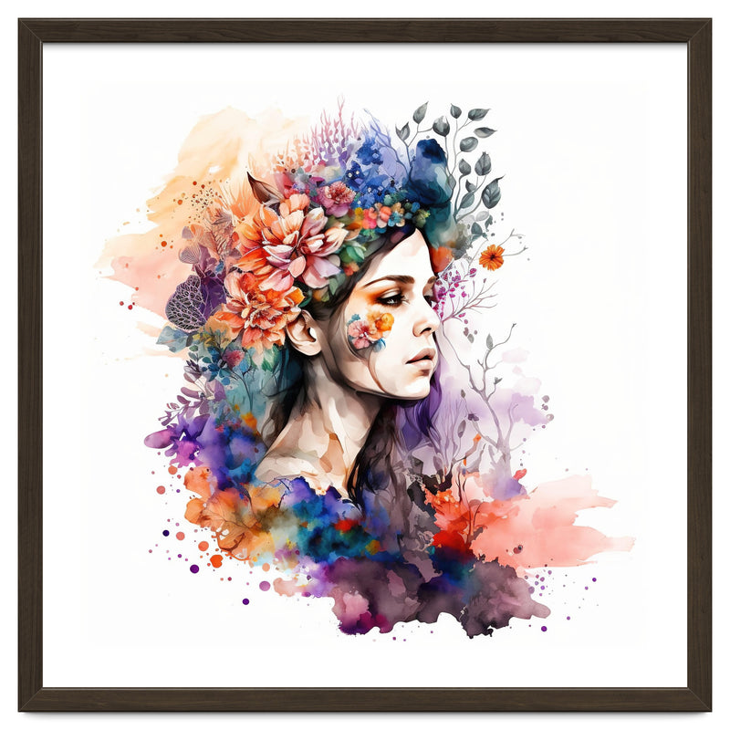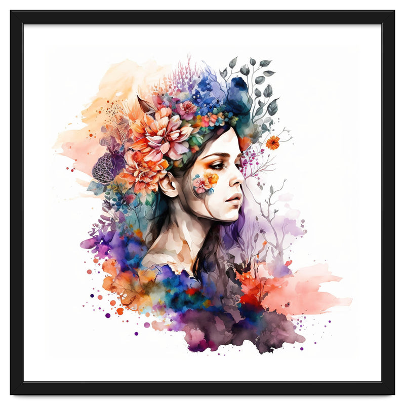 Close up watercolor portrait of a woman emerging from airy washes as violet and blue blooms gather around the temple and cheek. Soft gradients and generous negative space keep the profile crisp while transparent layers reveal subtle paper texture, creating a refined contemporary focal point for calm interiors.