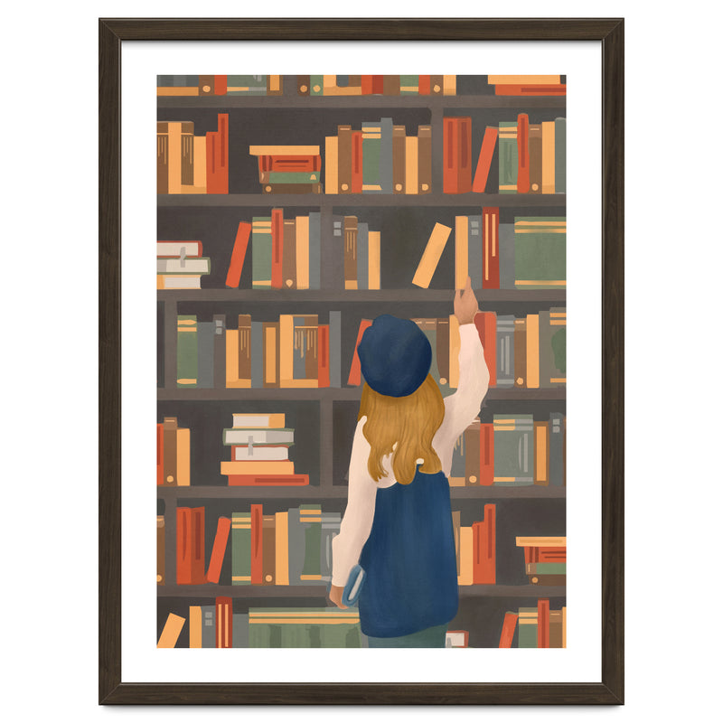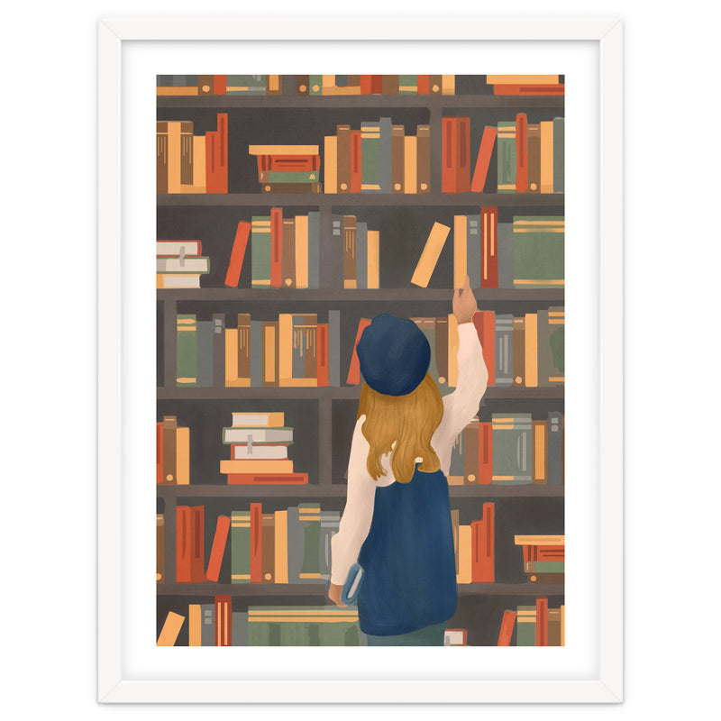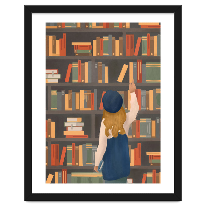 A soft, painterly illustration of a woman reaching for a book in a library, capturing themes of curiosity, stillness, and the quiet joy of discovery.