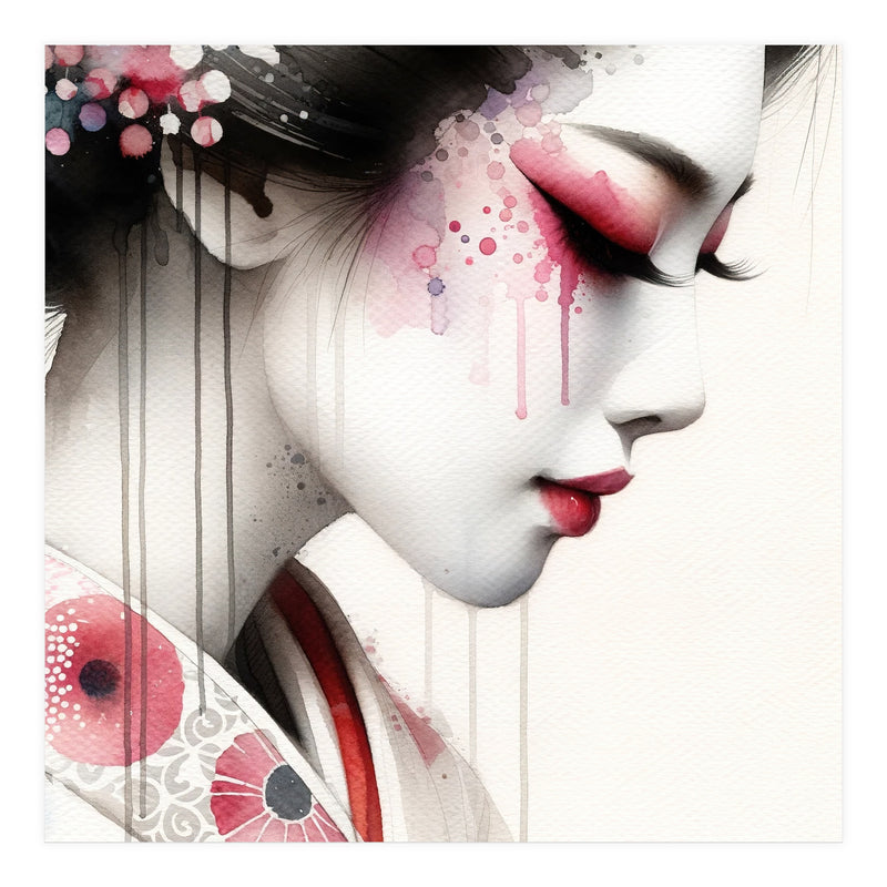 Close up watercolor portrait of a modern geisha in quiet side view. Soft rose washes shape eyelid and cheek while delicate droplets drift near the temple. A refined floral kimono pattern adds texture and the open background preserves clean negative space, keeping the silhouette crisp at large scale for elegant contemporary interiors.
