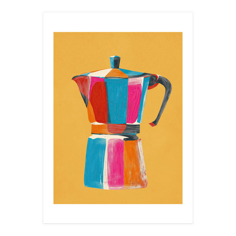 A vibrant illustration of a classic moka pot reimagined in bold color blocks of teal, pink, orange, and red. Set against a warm golden background, the textured brushstrokes and geometric shapes create a playful, modern still-life composition full of energy and contemporary style.