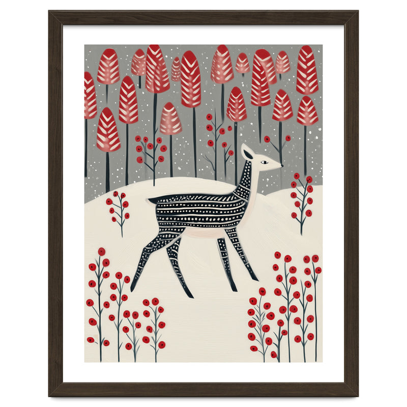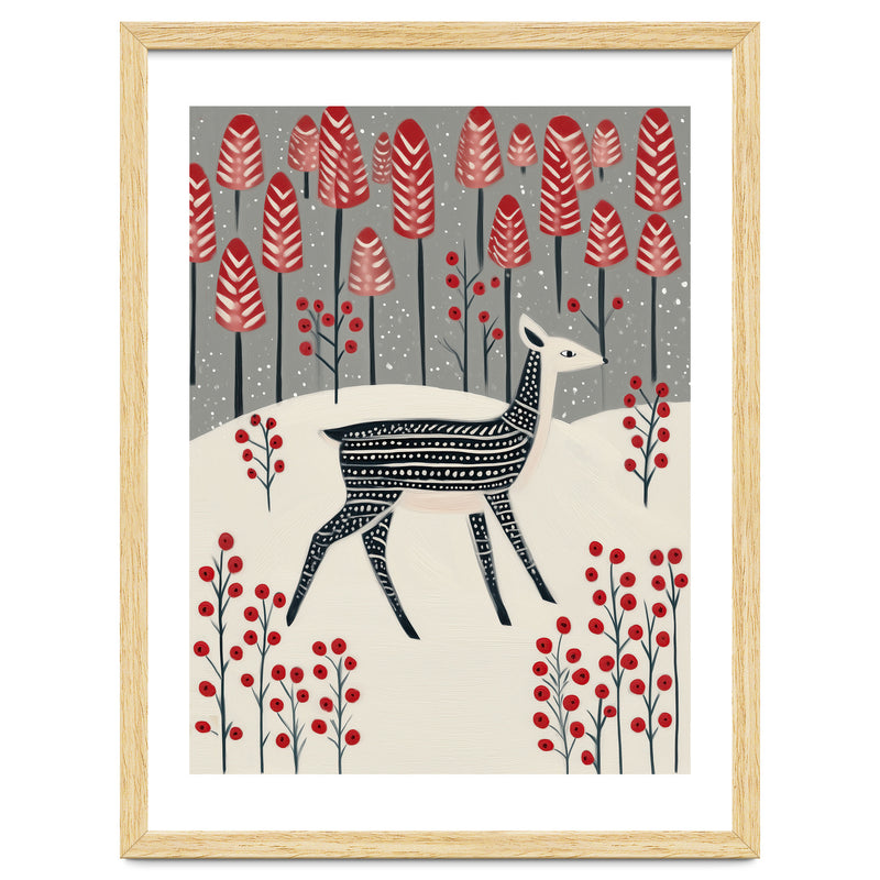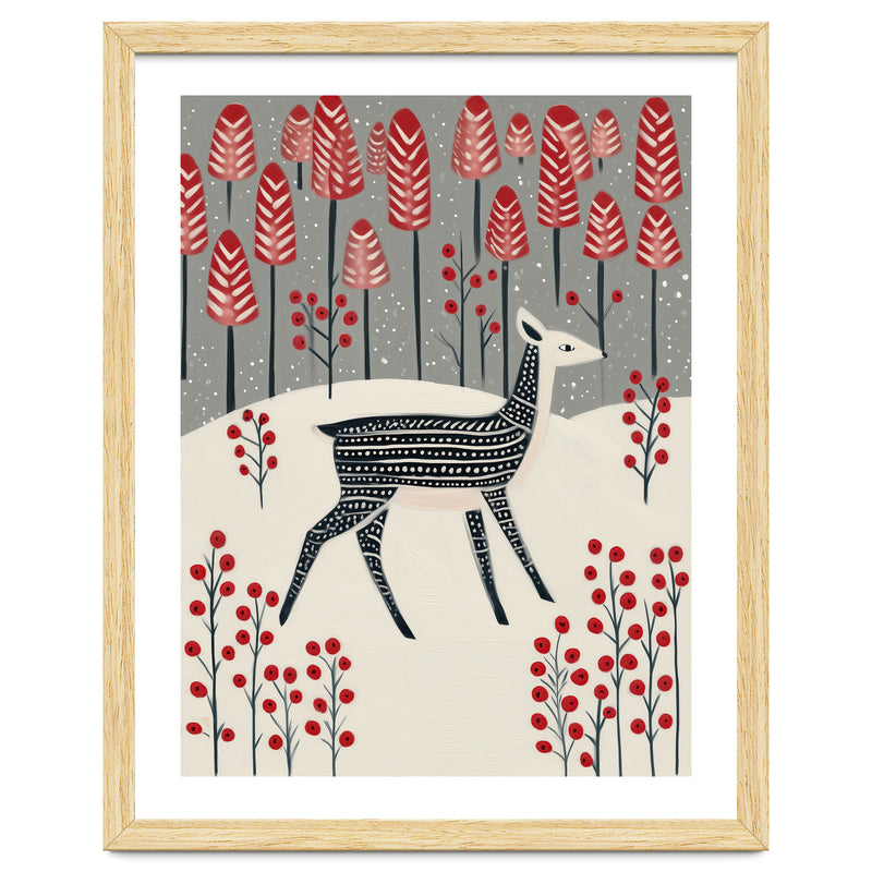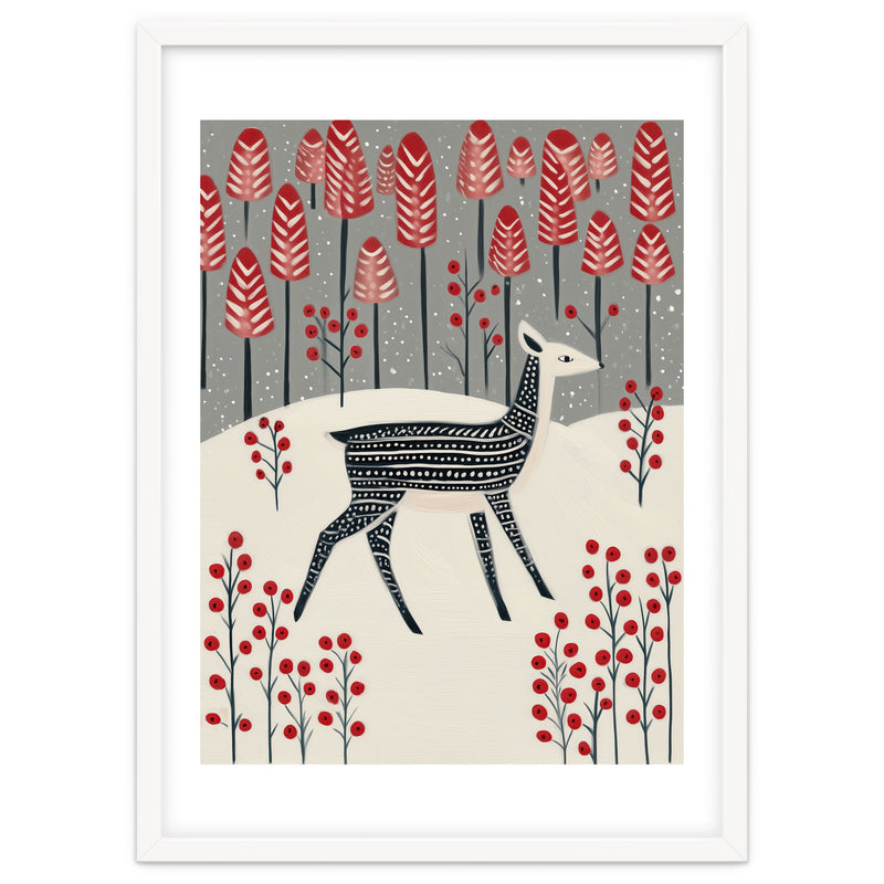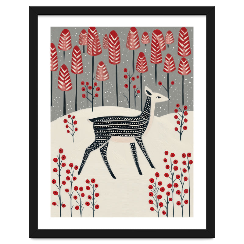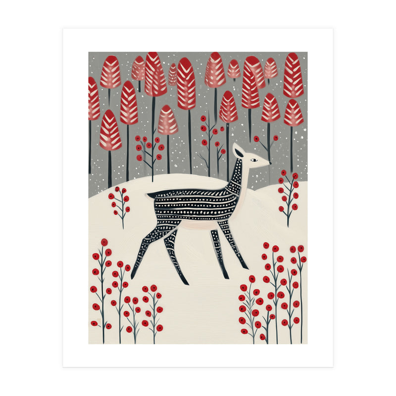 A charming winter woodland illustration featuring a delicate fawn wandering through a snowy landscape dotted with bold red trees and berries. The composition blends whimsy and calm, creating a storybook-like atmosphere.