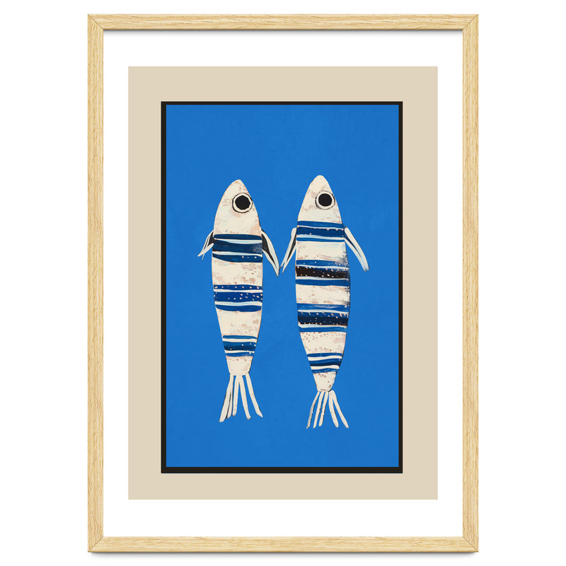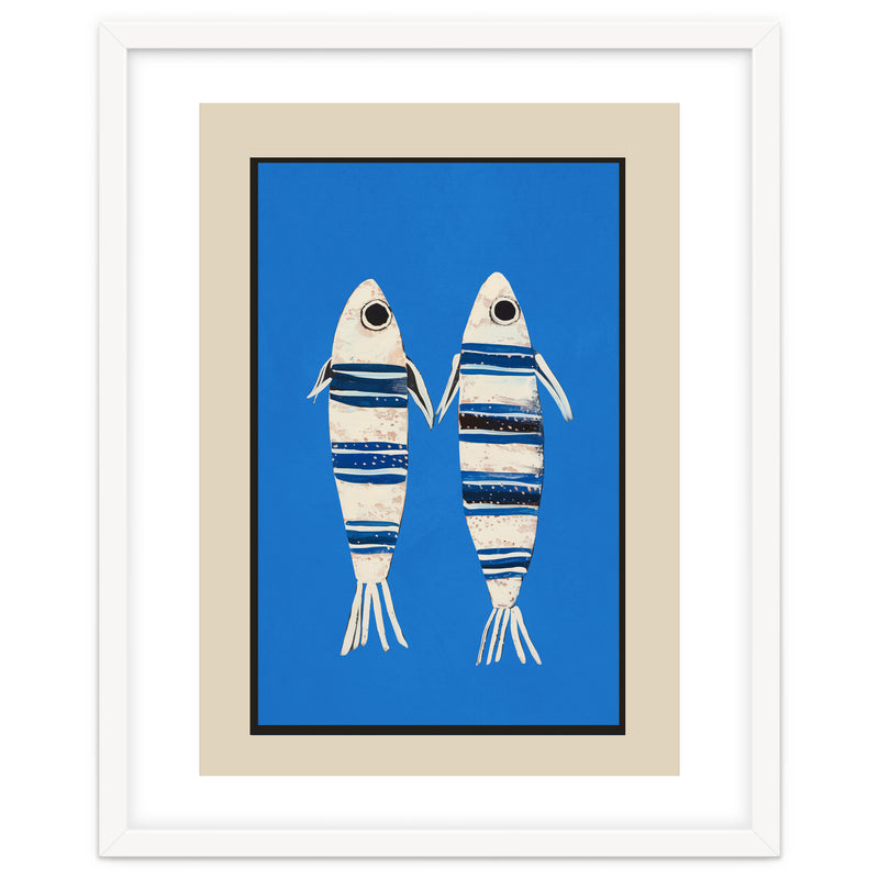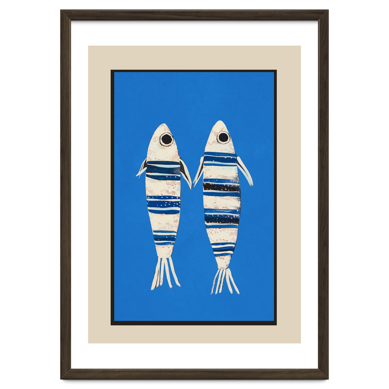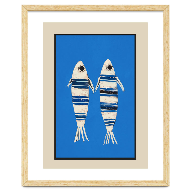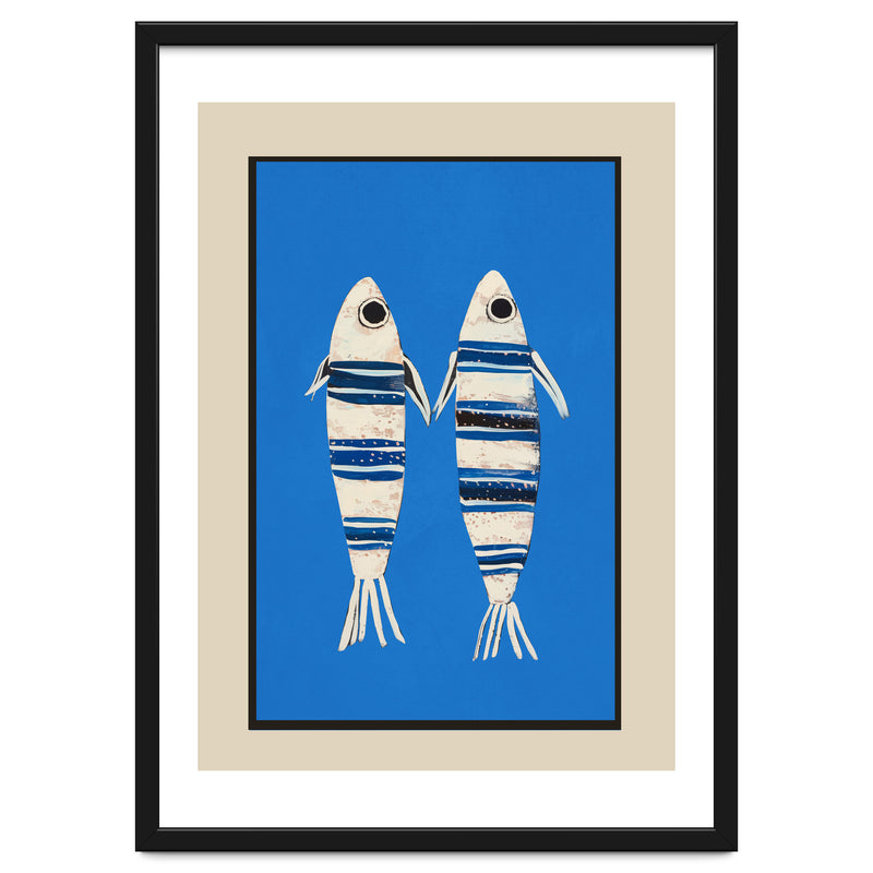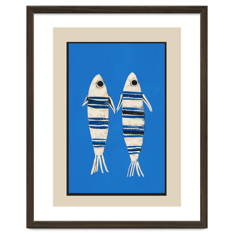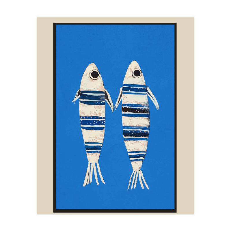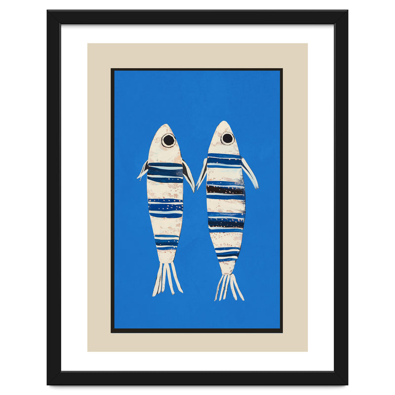 Two stylized fish float against a vivid blue background, creating a playful coastal composition with a clean, modern feel. The striped detailing and simple forms give the piece a charming balance of whimsy and graphic clarity.
