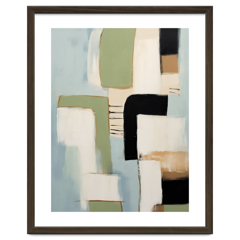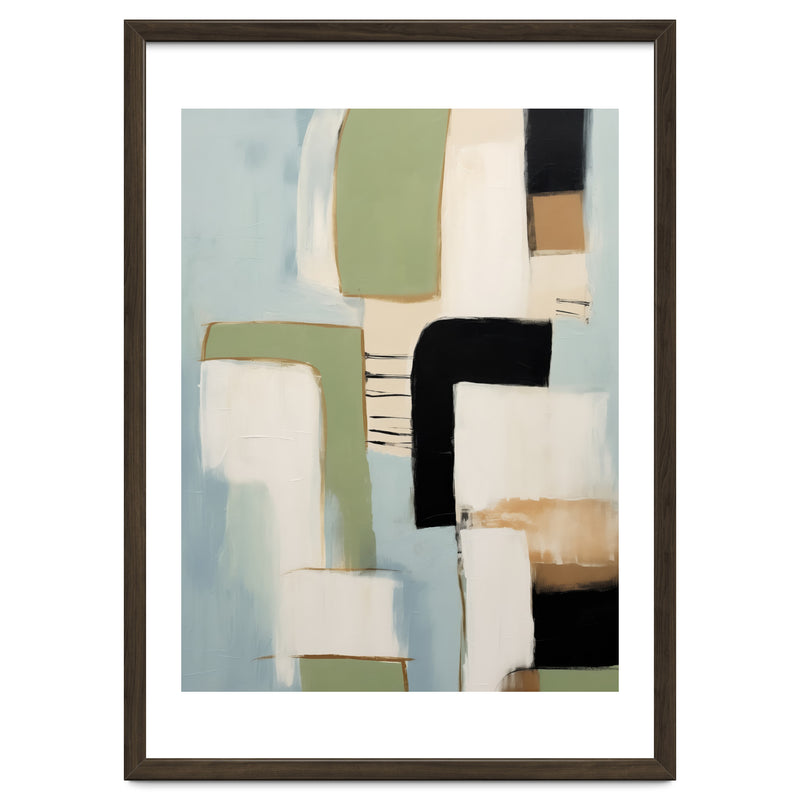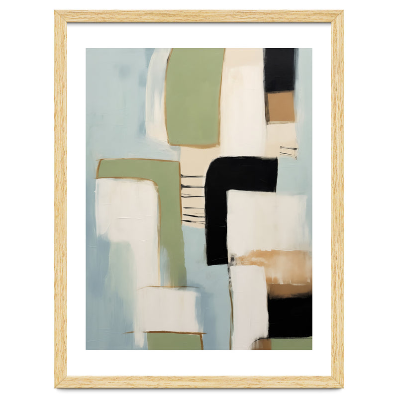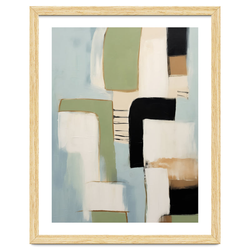 A contemporary abstract composition defined by bold geometric forms and layered color blocking. Soft sage, muted blue, warm beige, and deep black shapes create a refined, balanced visual rhythm.