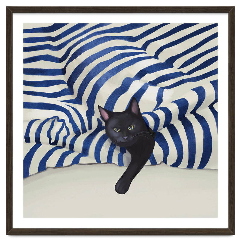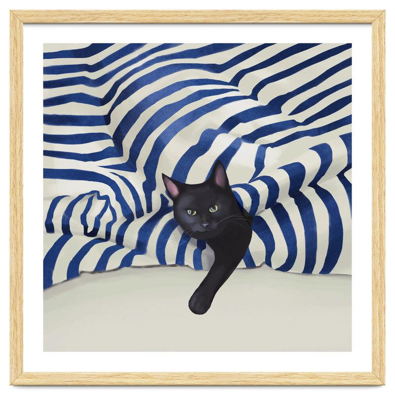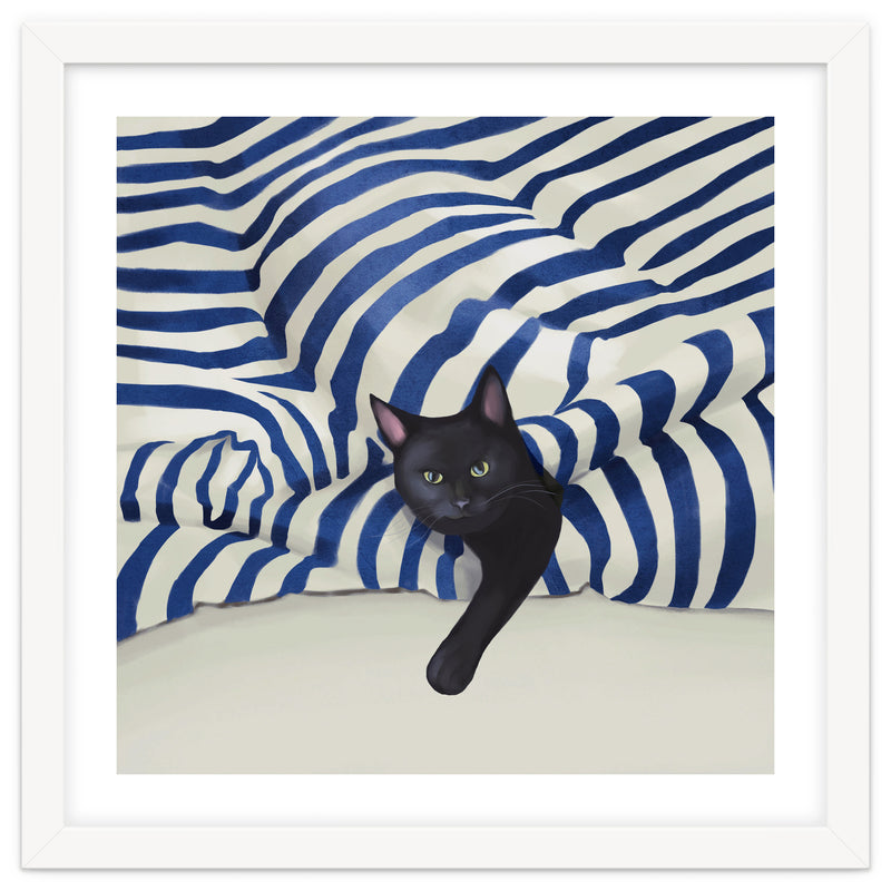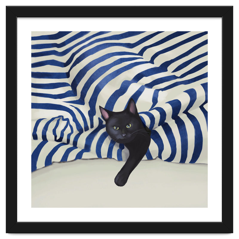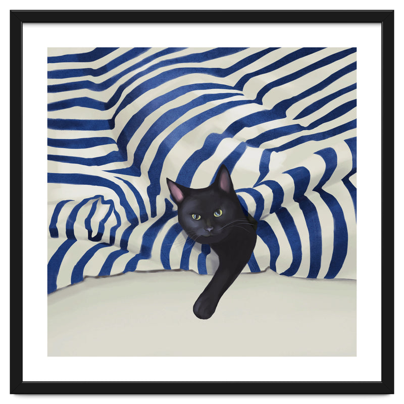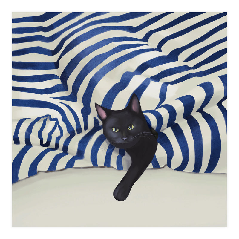 A playful illustration of a curious black cat emerging from bold striped bedding. The graphic pattern contrasts beautifully with the soft, watchful expression of the feline.