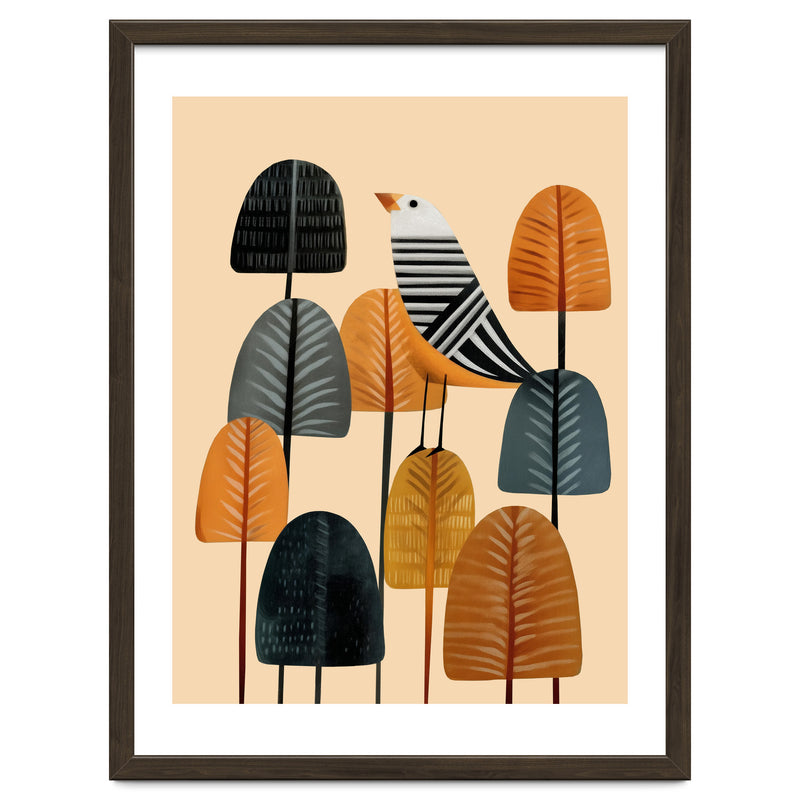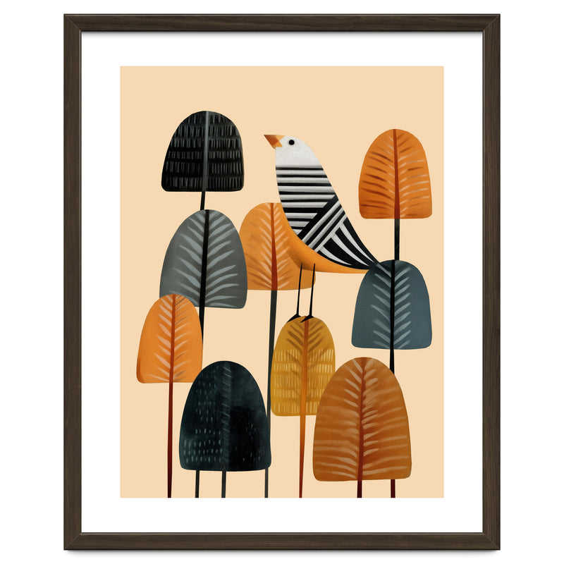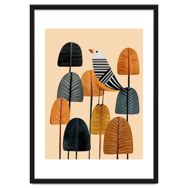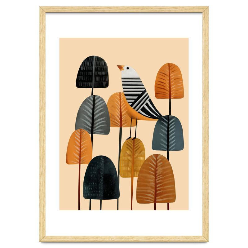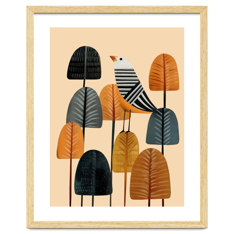 A charming modern woodland composition featuring a stylized songbird perched among abstract autumn trees. The simplified shapes and clean silhouettes create a balanced, graphic scene that feels both playful and refined.