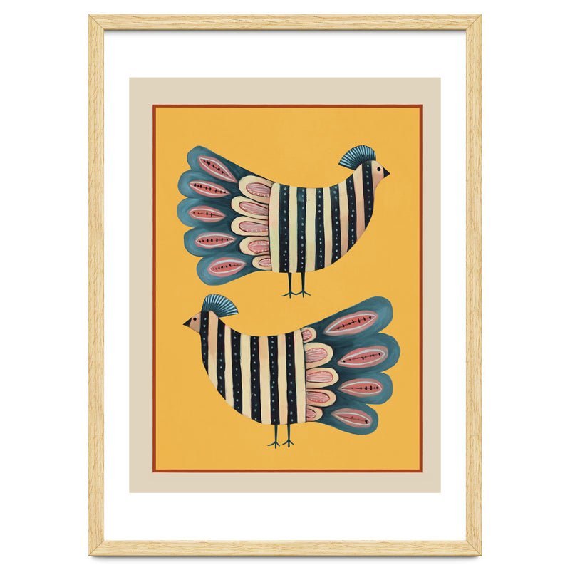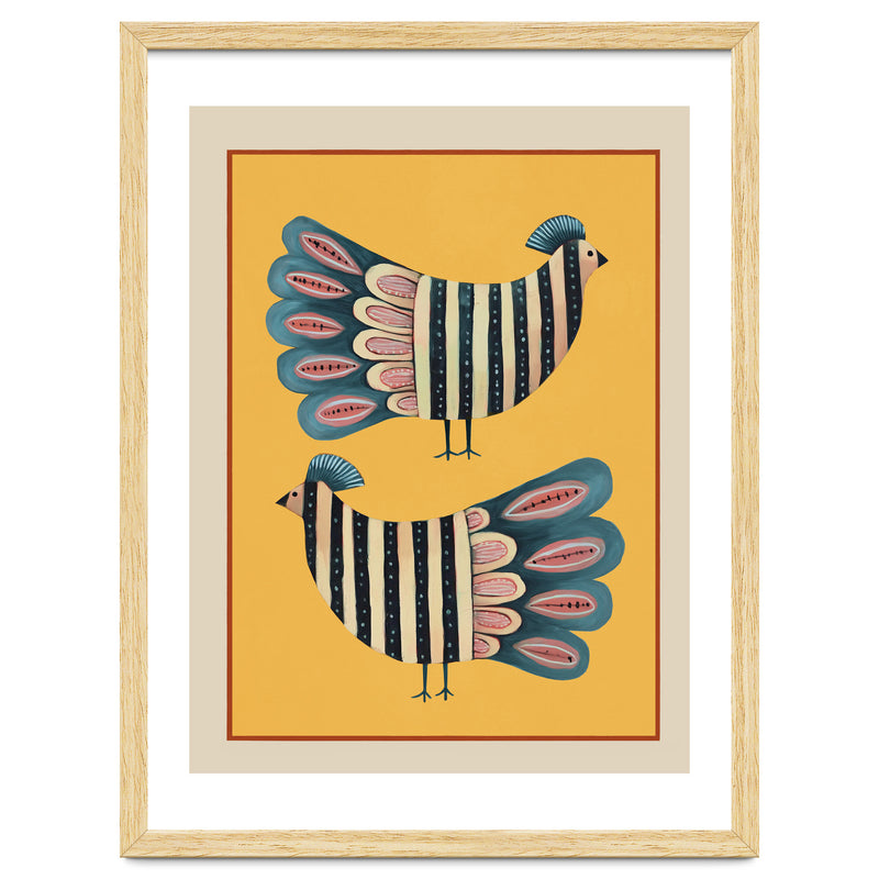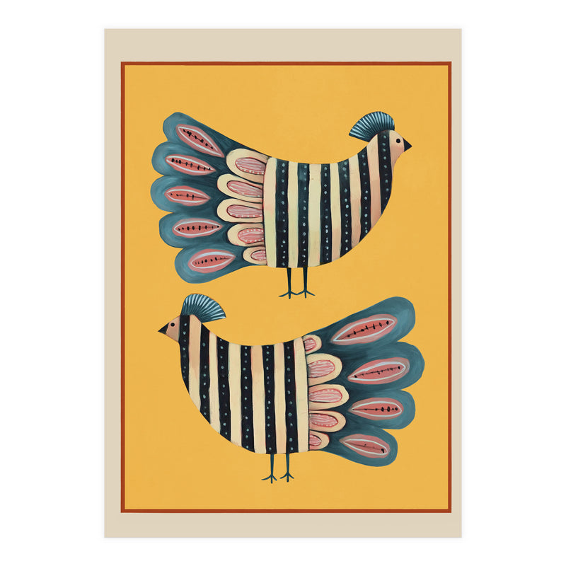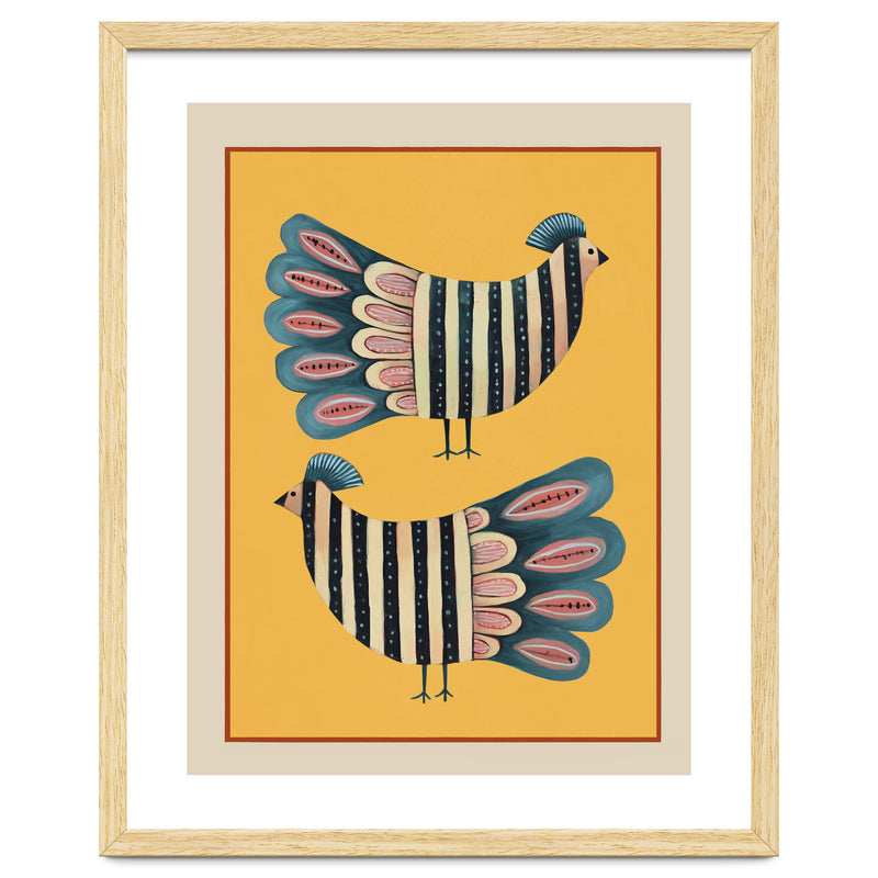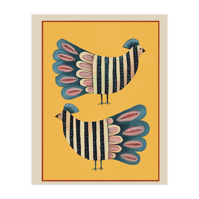 A charming modern folk-inspired composition featuring a pair of stylized striped birds set against a glowing golden backdrop. The mirrored arrangement creates a pleasing sense of symmetry, giving the artwork a balanced and decorative presence.