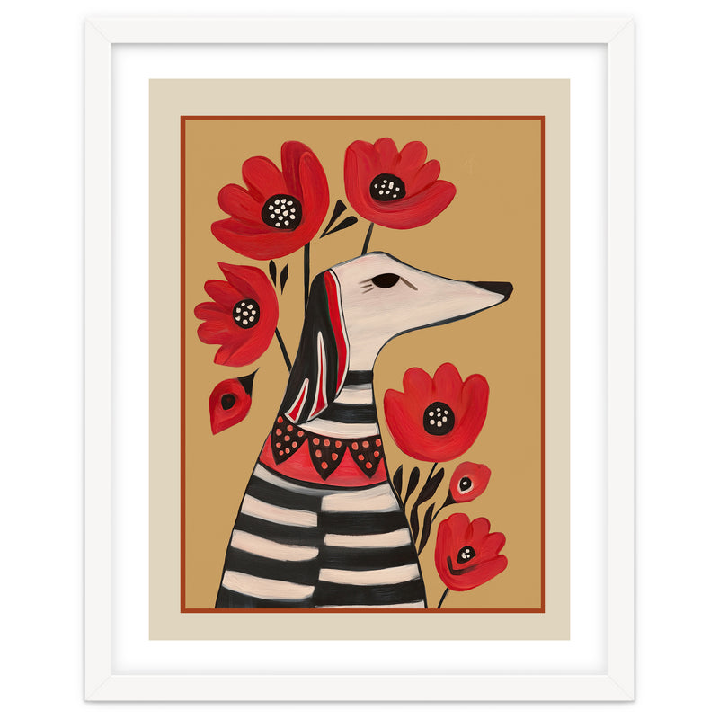 A charming modern folk-inspired portrait featuring a stylized striped dog surrounded by bold red poppies. Set against a warm neutral backdrop, the clean silhouette and graphic detailing create a playful yet sophisticated focal point.