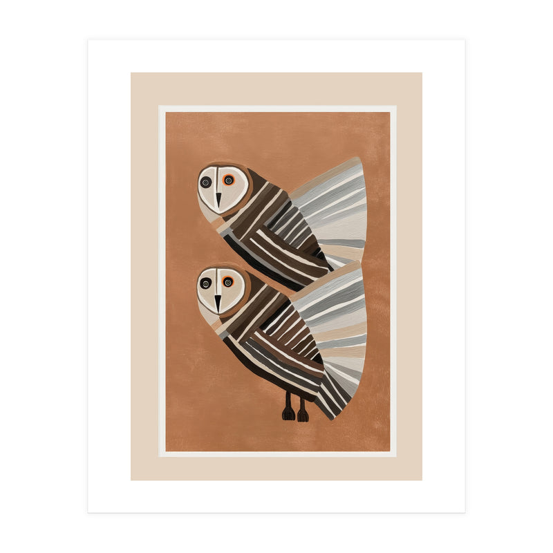 A captivating modern wildlife composition featuring a pair of stylized owls perched in graceful alignment. Set against a warm earthy backdrop, the layered forms and bold striping create a refined yet approachable visual statement.