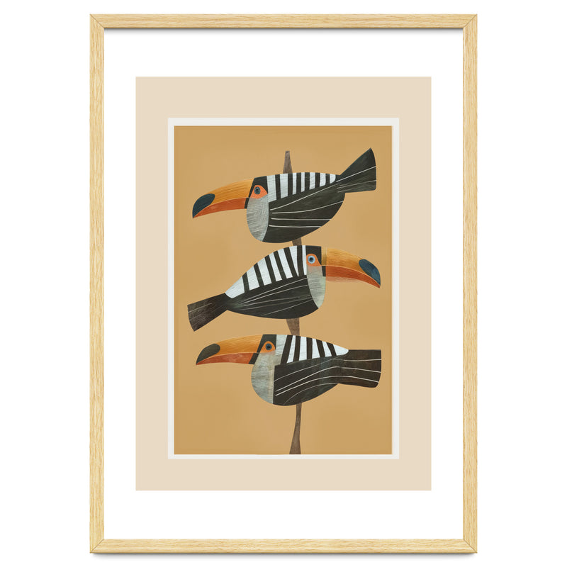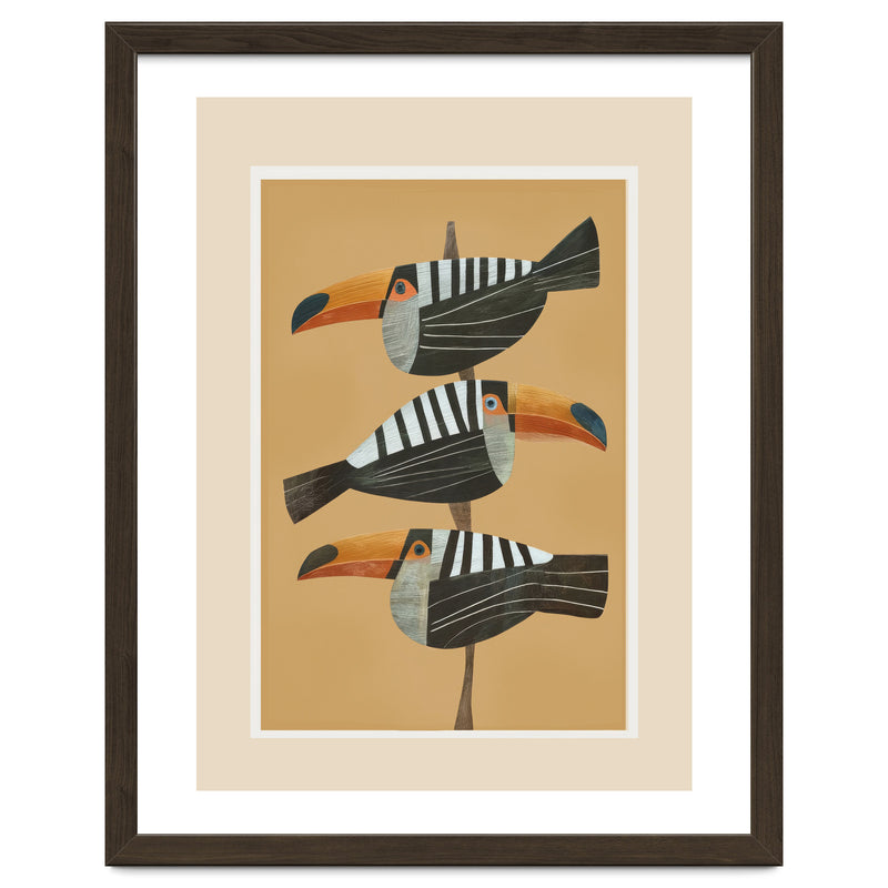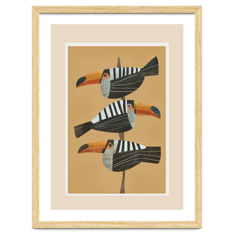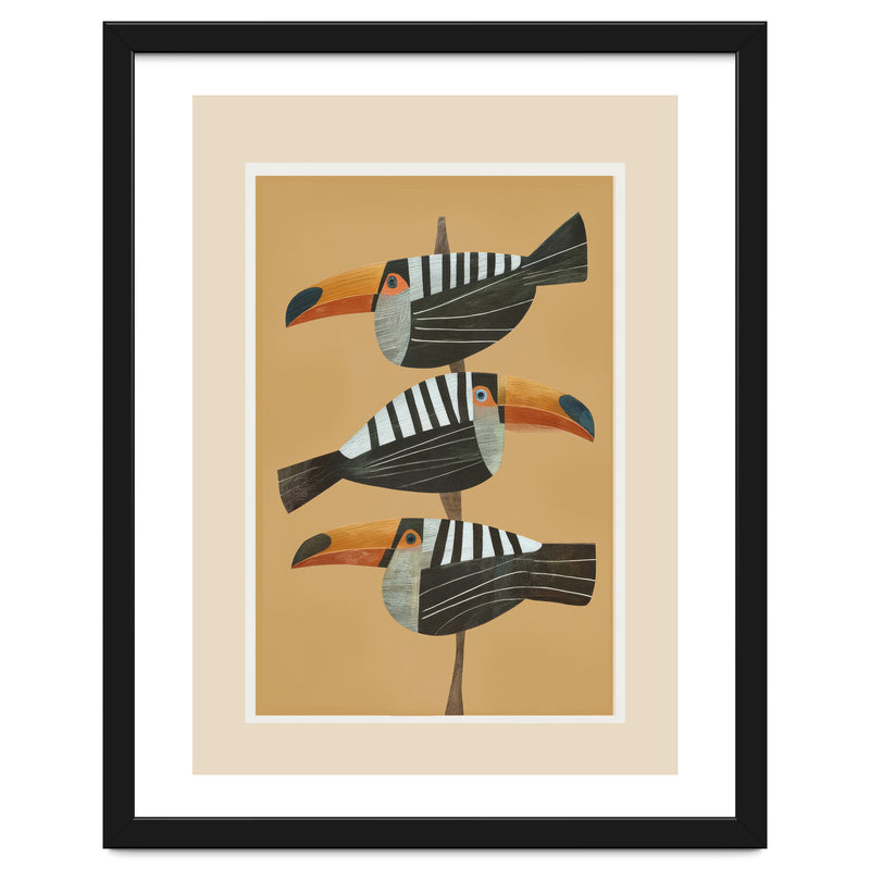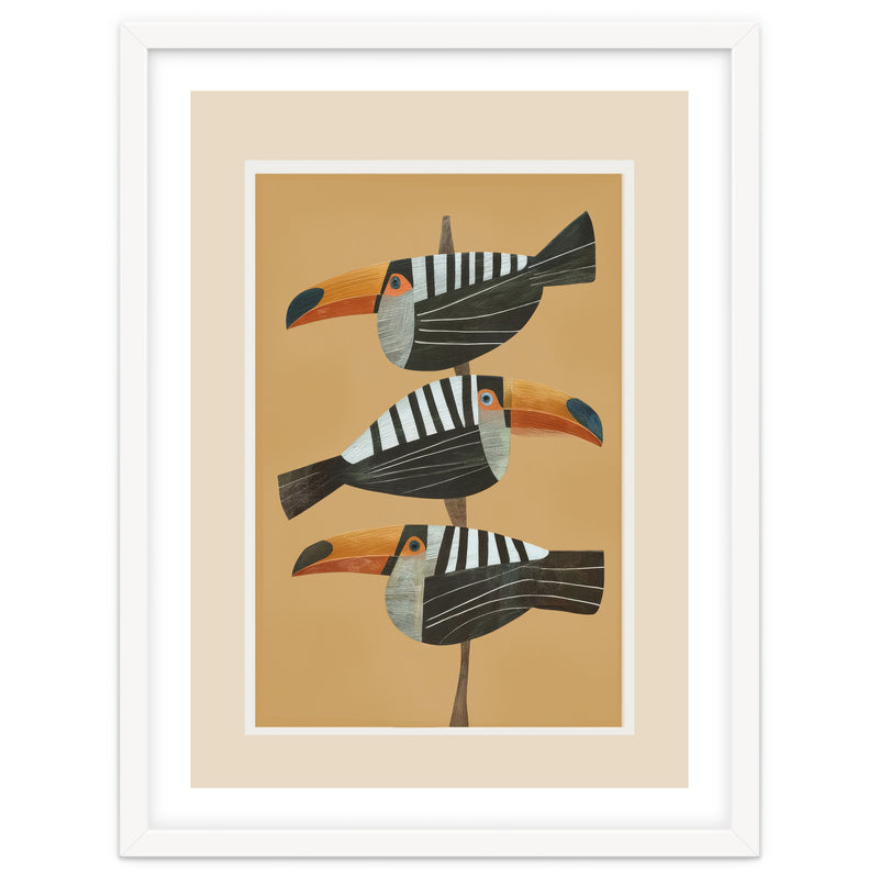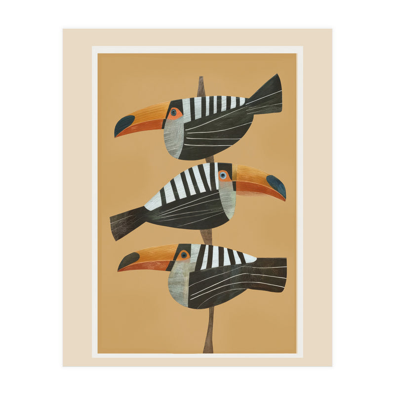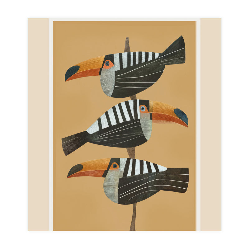 A bold tropical bird illustration featuring three stylized toucans perched in a vertical composition against a warm golden backdrop. The clean layout and balanced spacing create a striking, modern focal point.