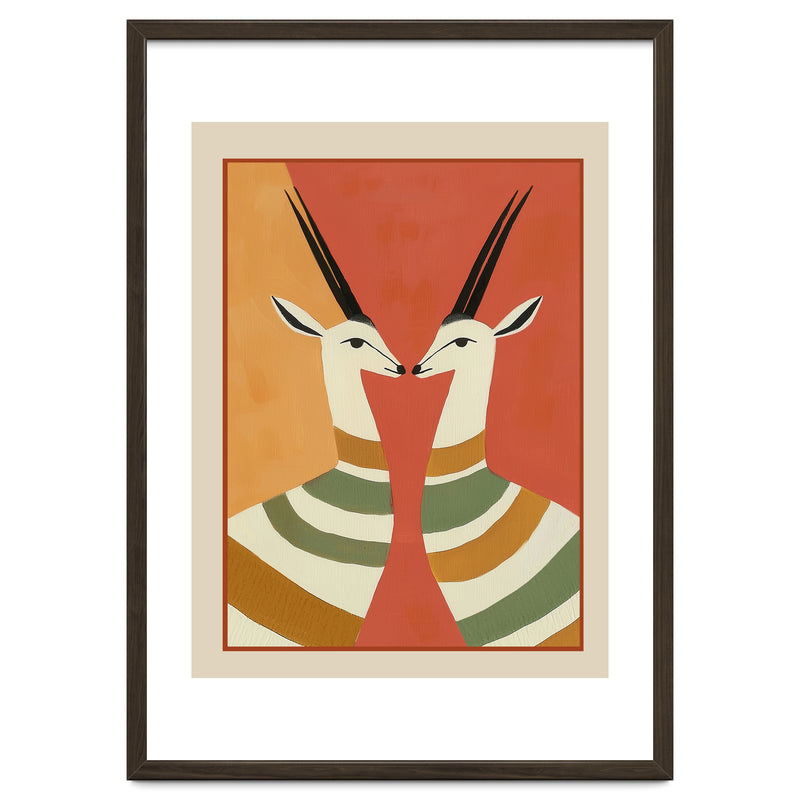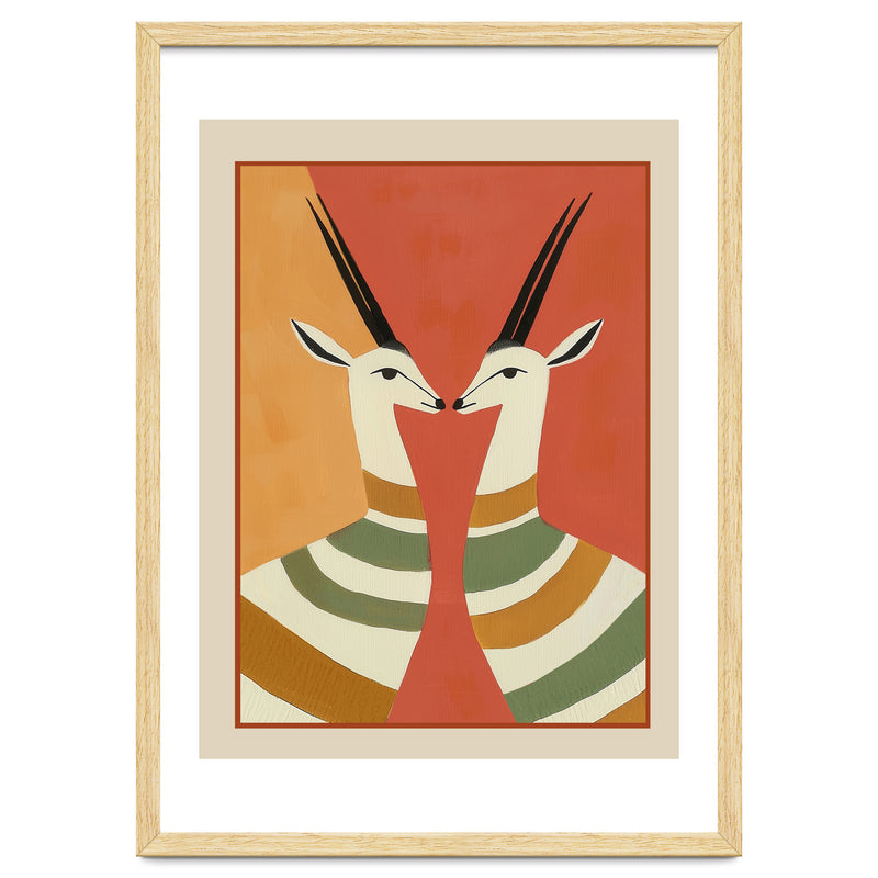 This contemporary animal portrait pairs simplified gazelle forms with a rich palette of coral, peach, sage, and mustard. The balanced composition and graphic lines create a piece that feels both playful and refined, with a warm, collected presence.
