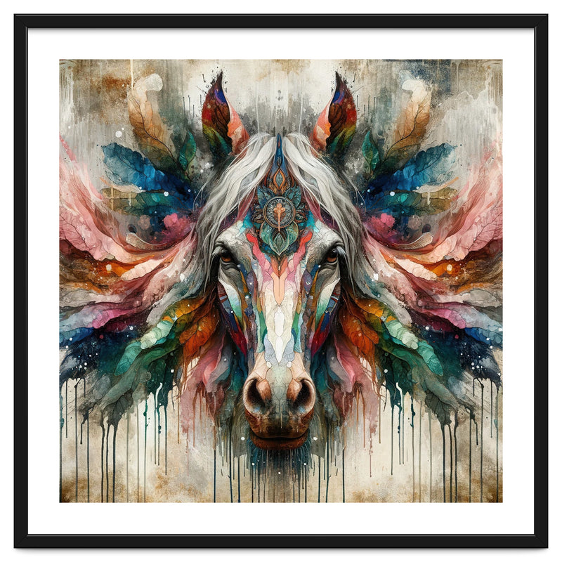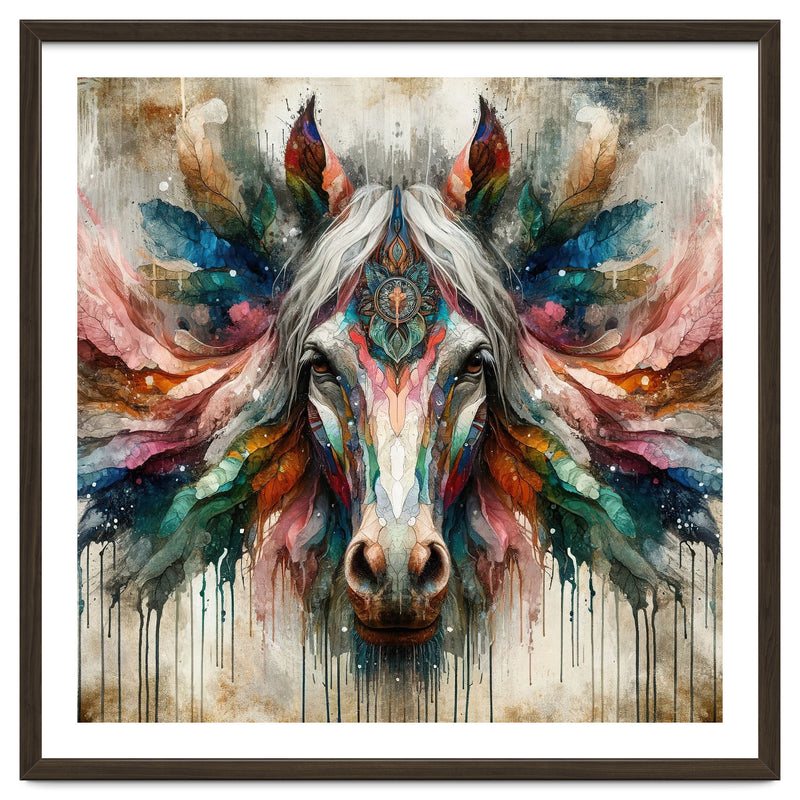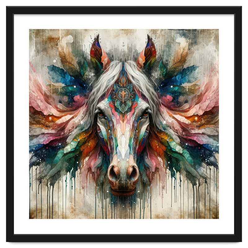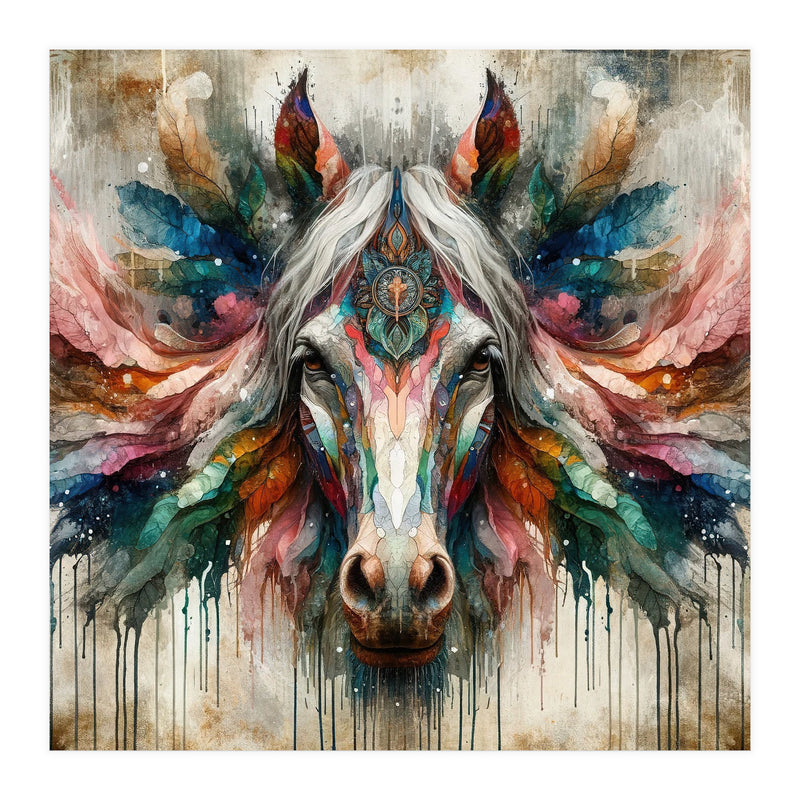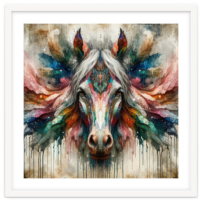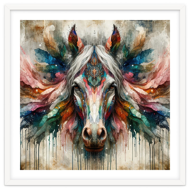 A symmetrical horse portrait with a pale mane, ornate mandala detail, feather like wings, and vivid watercolor tones with drips on a textured background.
