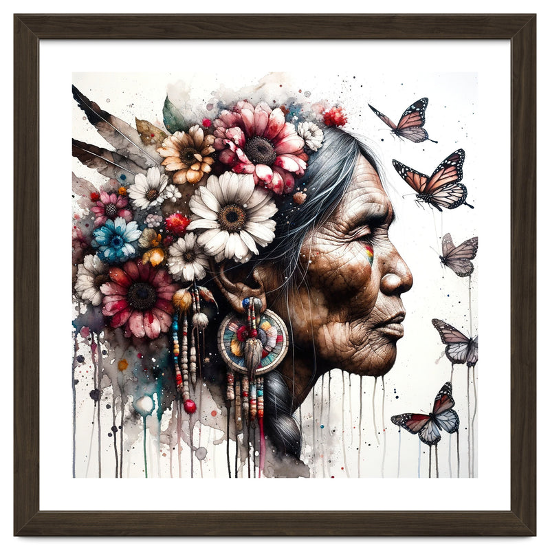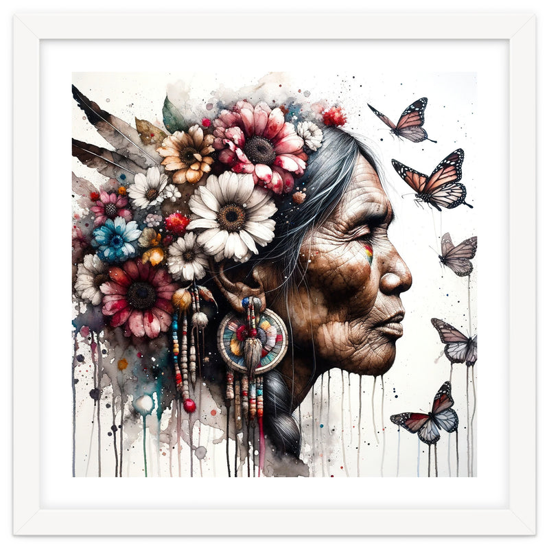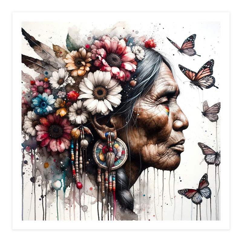 Close up watercolor portrait of an elder woman in side view crowned with wildflowers and soft feathers. Natural skin texture and fine lines are preserved with transparent washes while butterflies drift in clean negative space. Crisp edges keep the silhouette clear at large scale, creating a calm and elegant focal point for contemporary interiors.