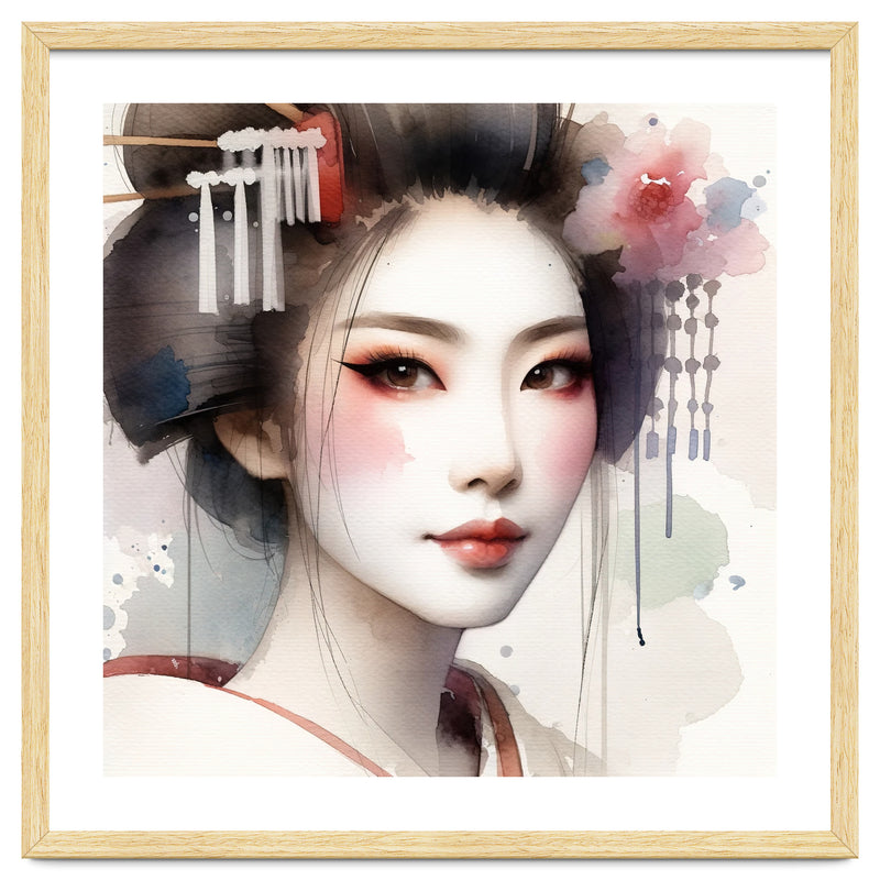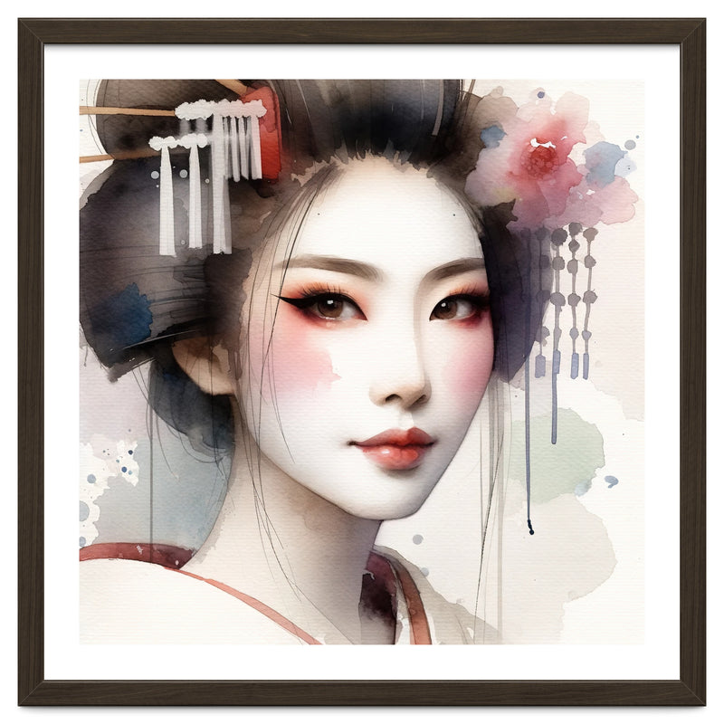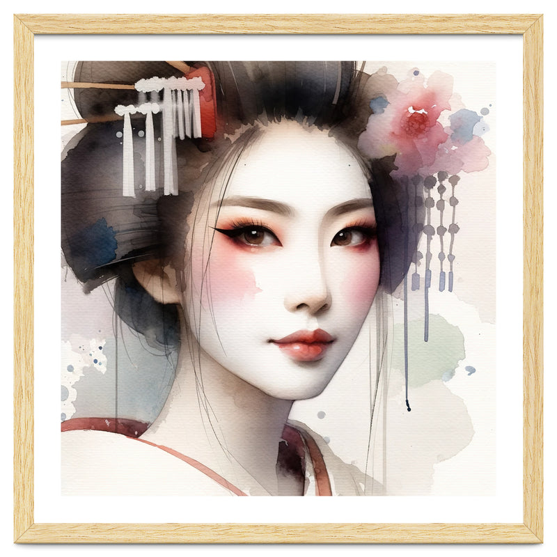 Close up watercolor portrait of a modern geisha in a gentle three quarter view with a rose tinted veil. Porcelain skin and soft coral notes shape eyelid and lips while a blossom and slim kanzashi accent a neat hair bun. Transparent washes and clean negative space keep the contour crisp at large scale for elegant contemporary interiors.