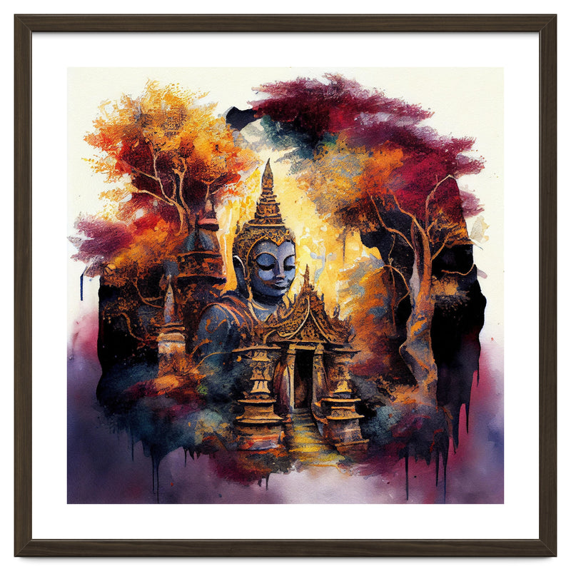 Buddha statue and temple gate surrounded by glowing autumn trees, soft mist and warm color washes, creating a calm sacred landscape focal point for contemporary interiors.