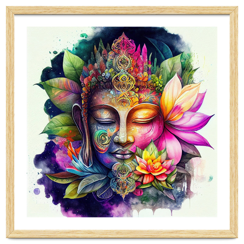 Buddha portrait wrapped in lush flowers and leaves on a deep night garden background, combining calm facial expression with vivid botanical color for a striking focal point in contemporary interiors.