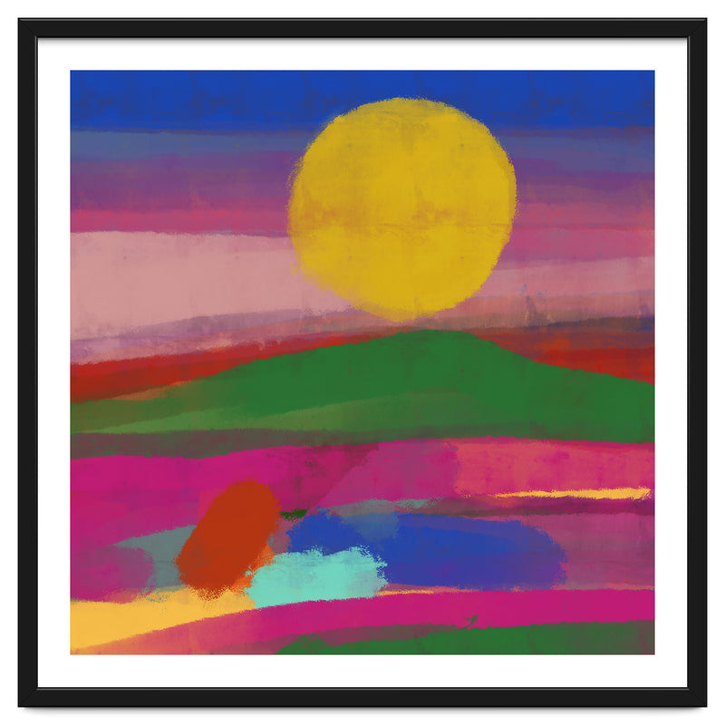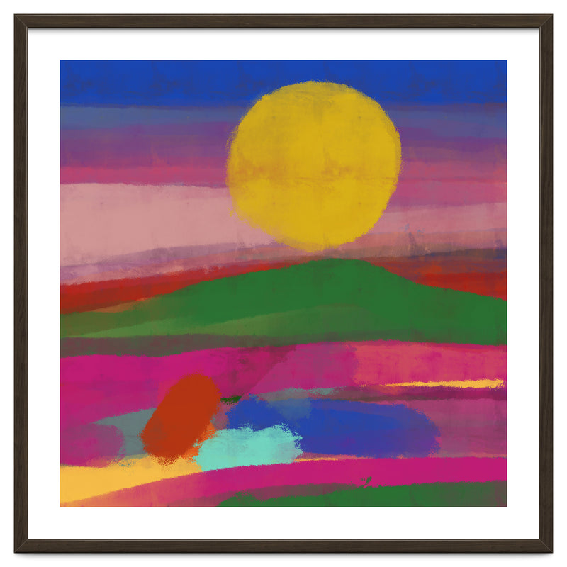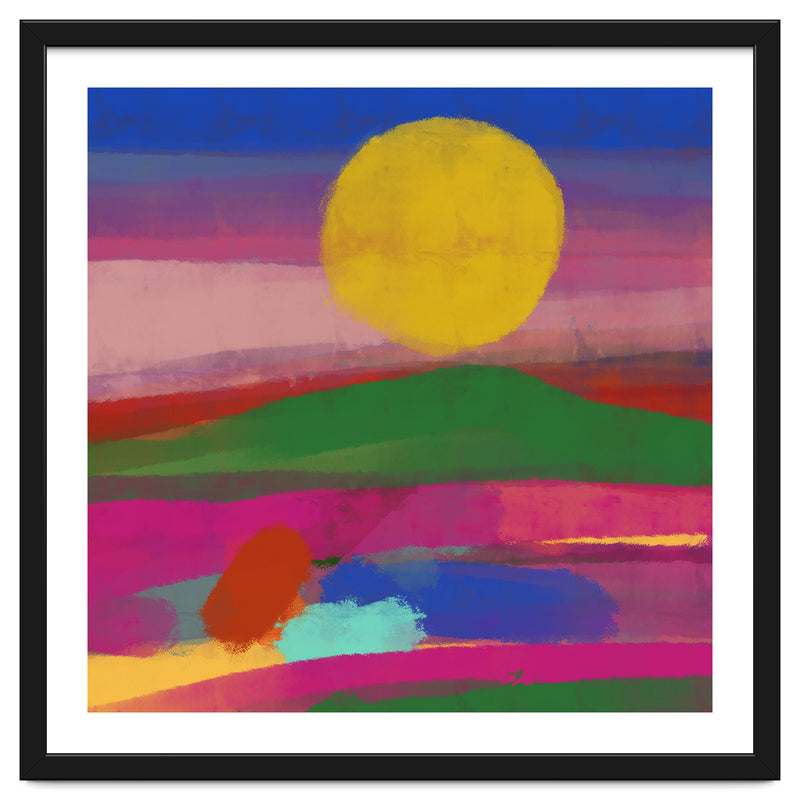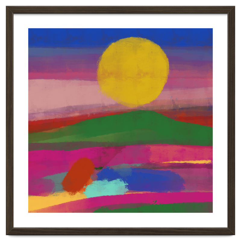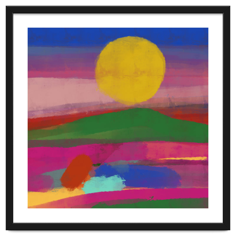 This colorful digital painting captures a striking abstract sunset or sunrise. Bold strokes of fuchsia, electric blue, and deep purple contrast vividly with the bright yellow orb and green hills, creating a dynamic, modern landscape with intense emotional depth.