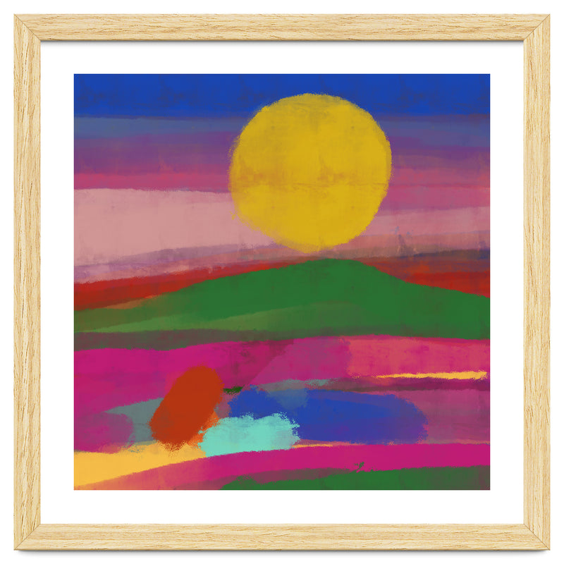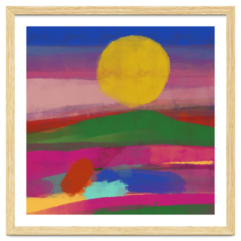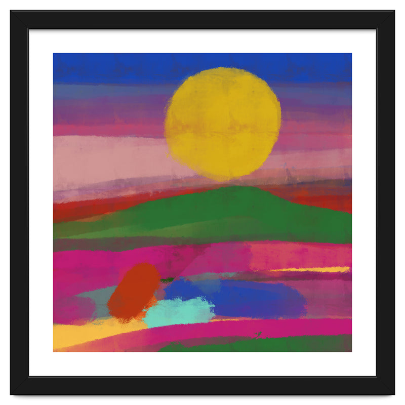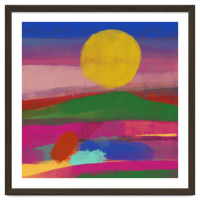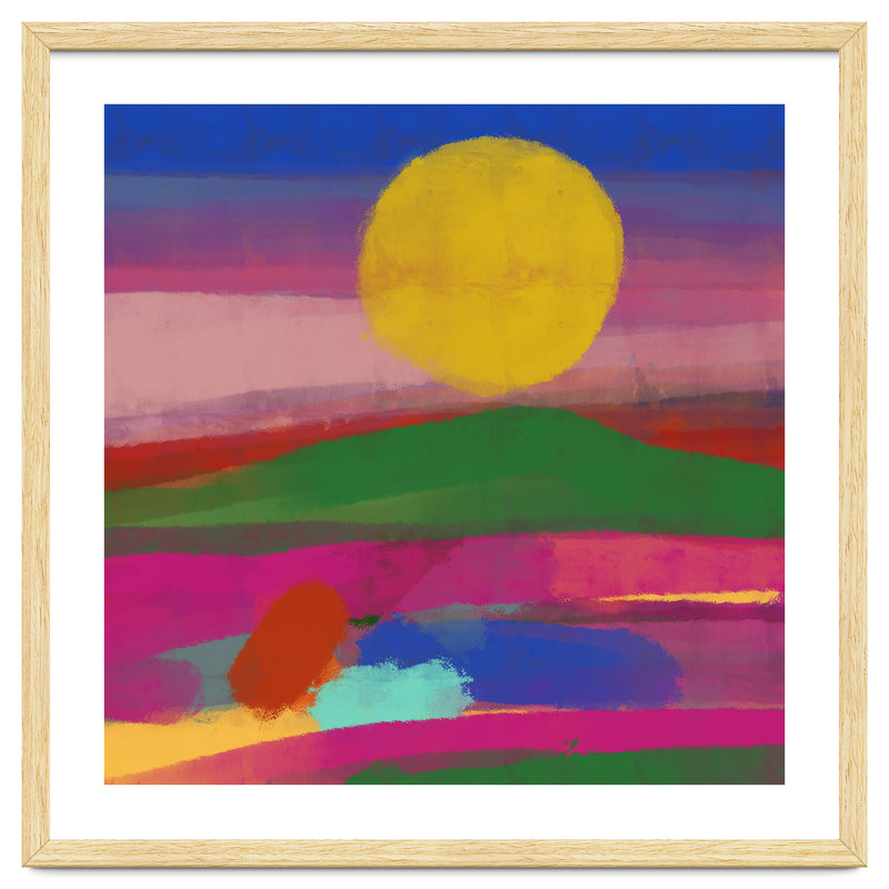 This colorful digital painting captures a striking abstract sunset or sunrise. Bold strokes of fuchsia, electric blue, and deep purple contrast vividly with the bright yellow orb and green hills, creating a dynamic, modern landscape with intense emotional depth.