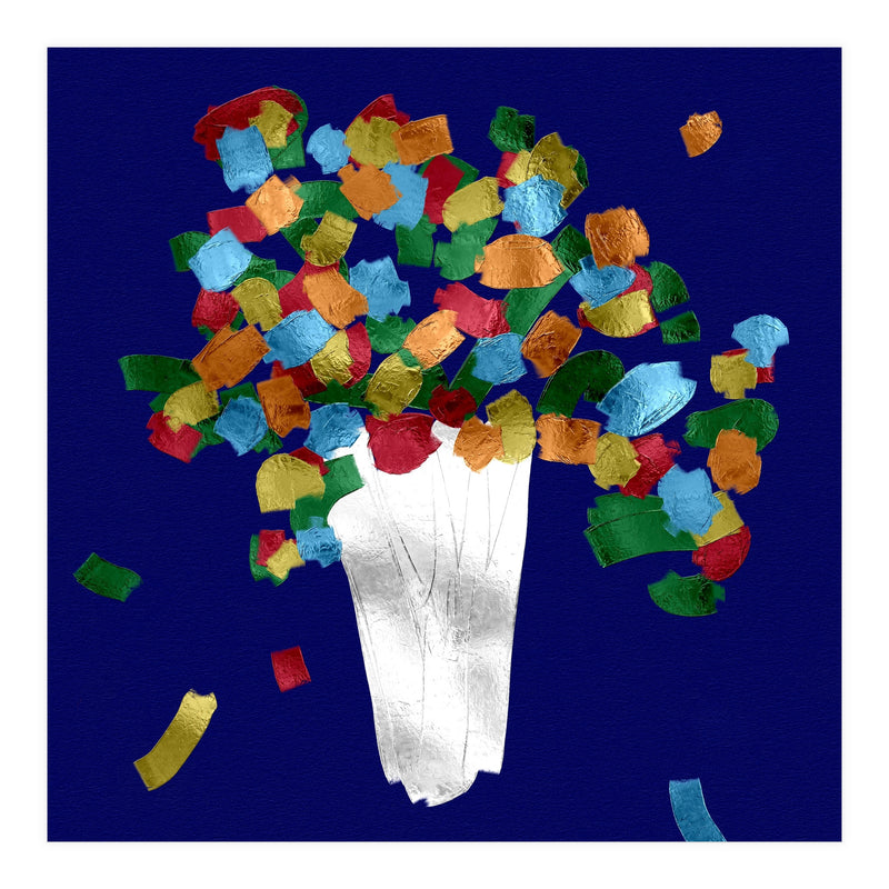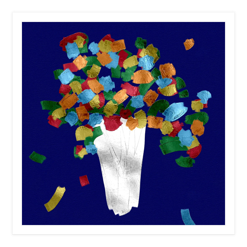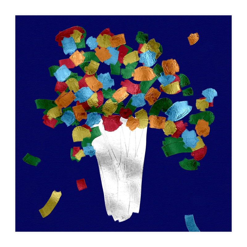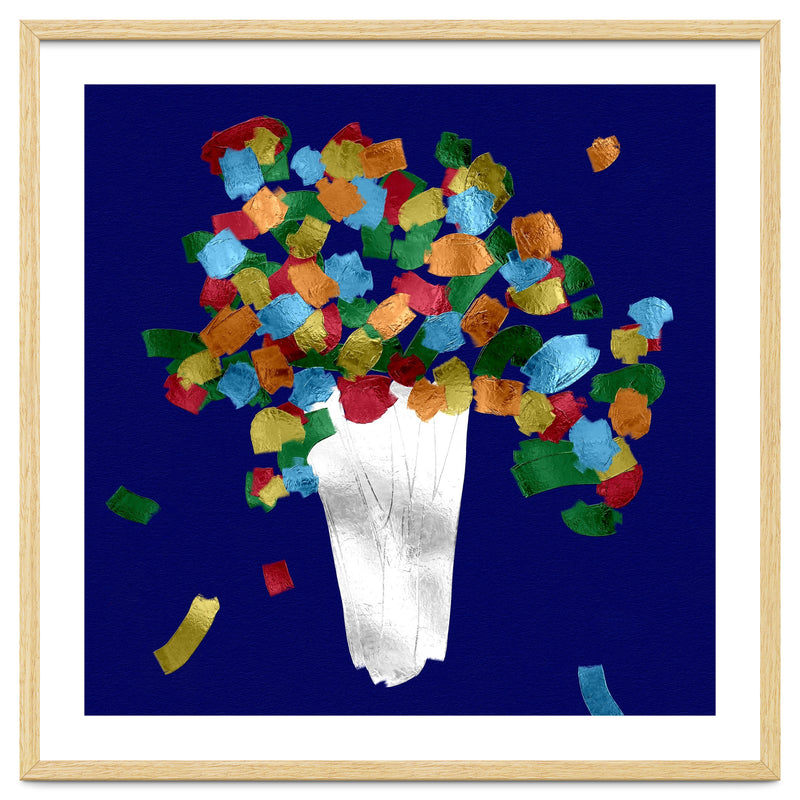 This striking abstract piece features a bouquet-like cluster of metallic confetti shapes in gold, red, orange, and blue. The vibrant, textured fragments create a joyous focal point, powerfully contrasting against the deep, saturated indigo background.