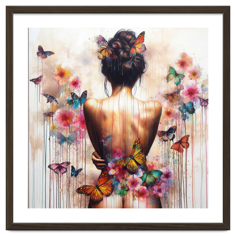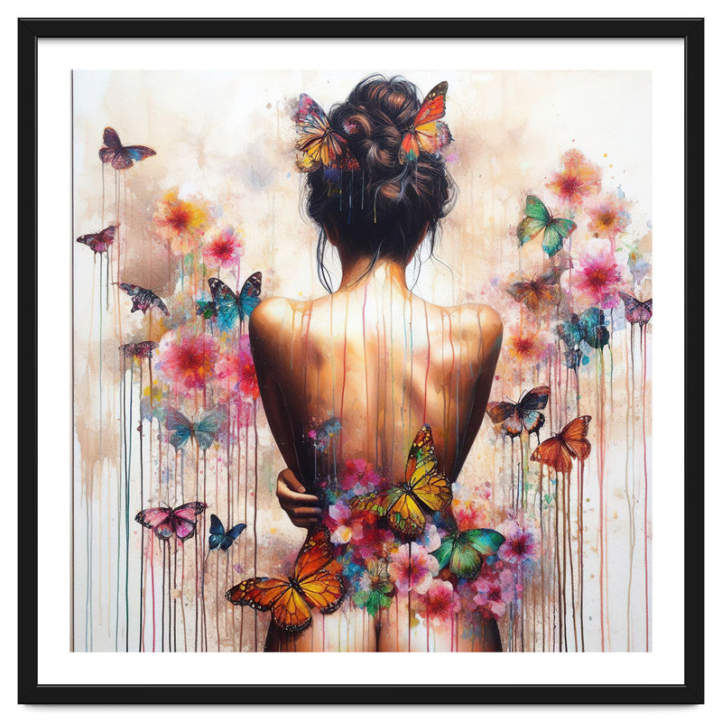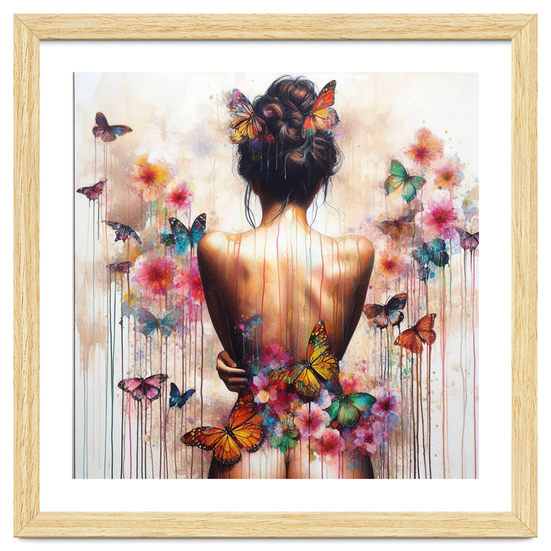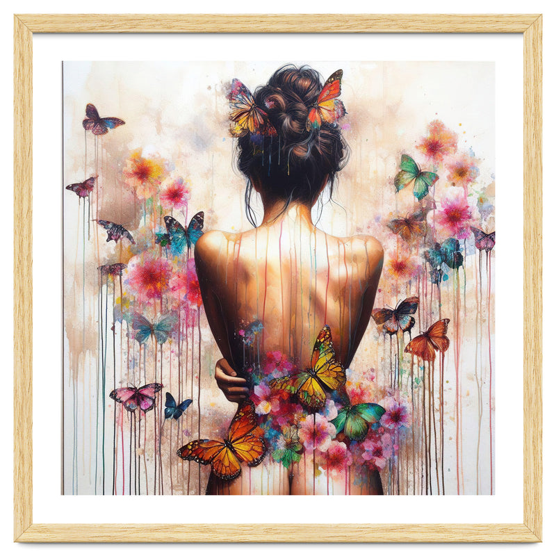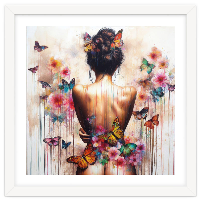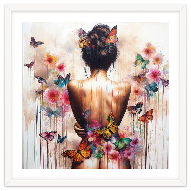 A graceful back portrait surrounded by butterflies and watercolor style florals. Soft splashes and clean negative space create an elegant contemporary accent for calm modern interiors.