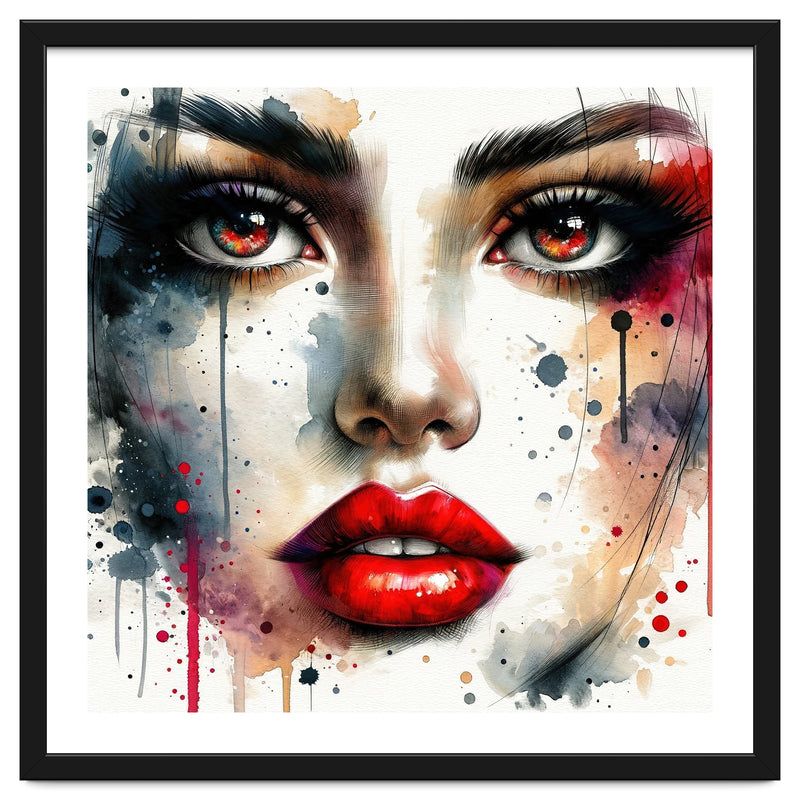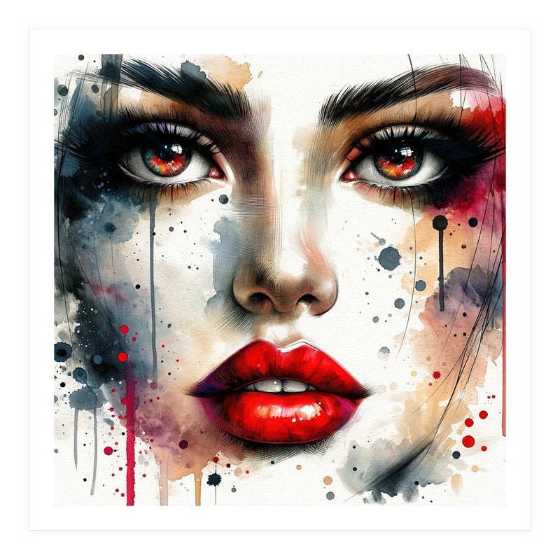 A refined close up portrait with expressive eyes and bold red lips on a clean white background. Soft watercolor washes, subtle splashes, and delicate drips add texture while crisp lash and lip detail keeps the face clear. The generous negative space creates a modern contemporary focal point for stylish interiors.