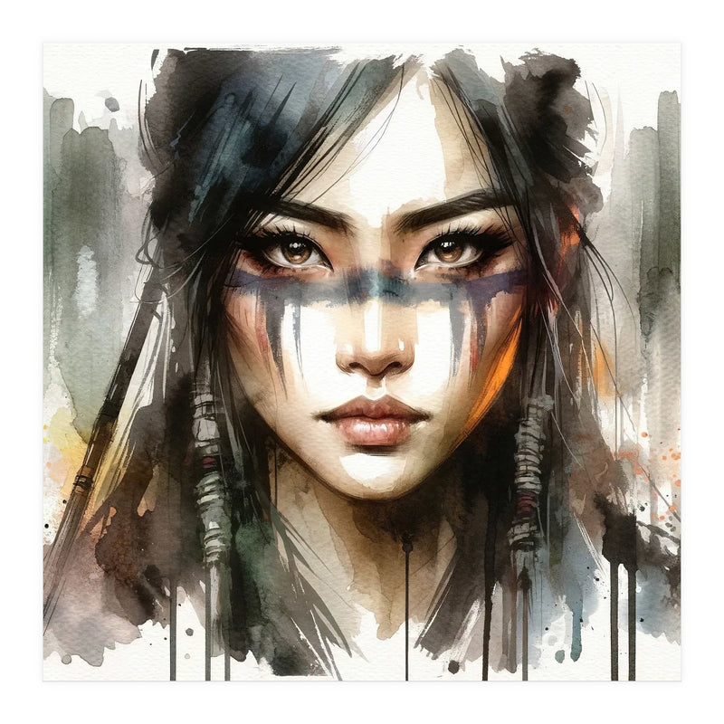 A centered portrait of a warrior woman with an intense gaze and bold face markings. Soft watercolor washes, ink like shadows, and clean negative space create a modern statement piece for contemporary interiors.