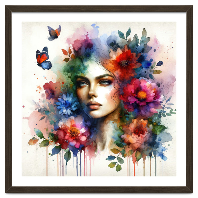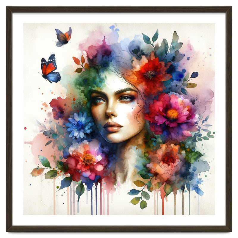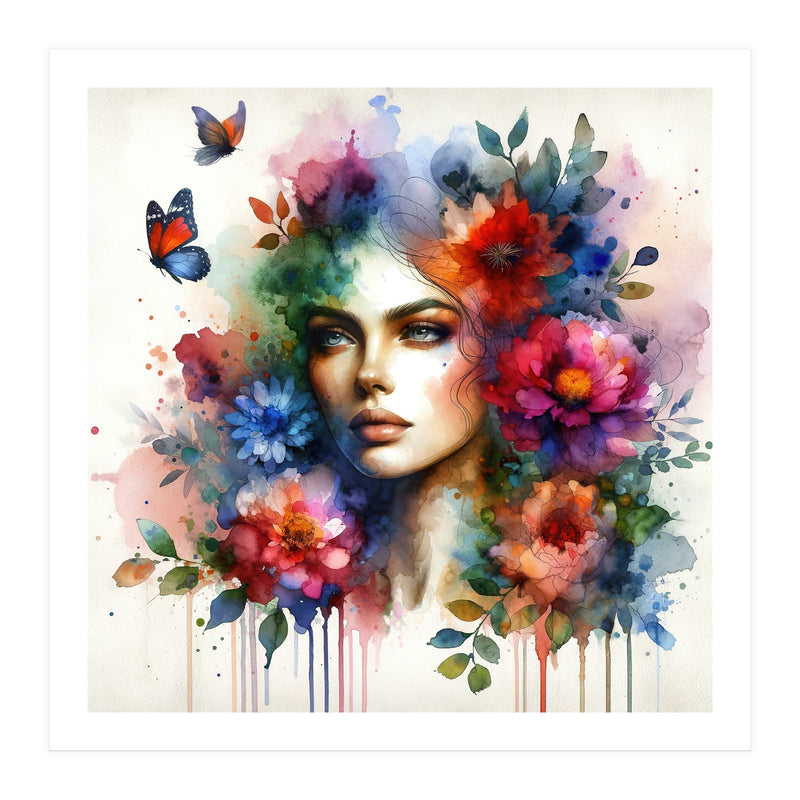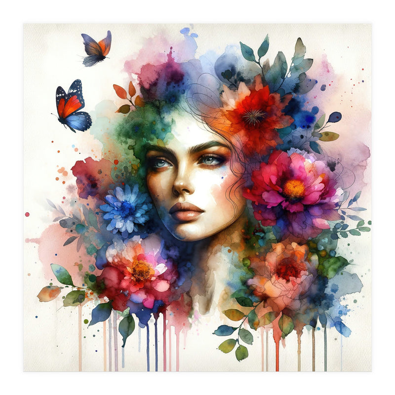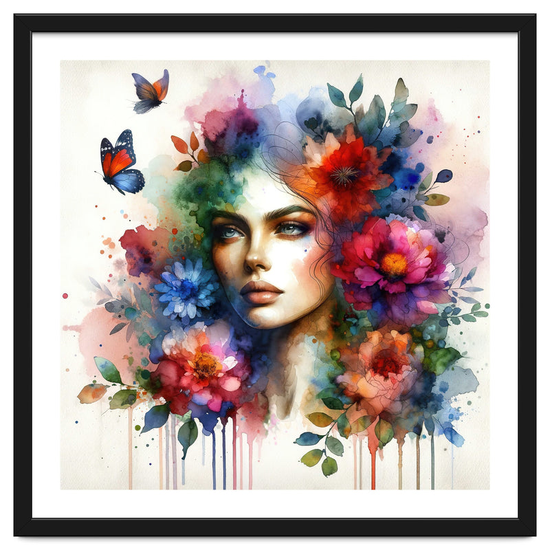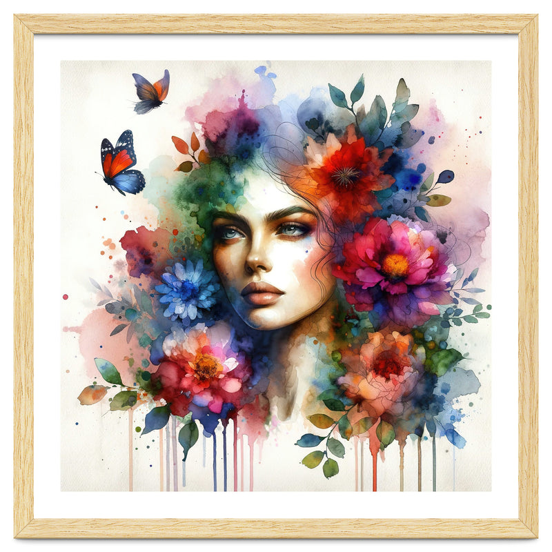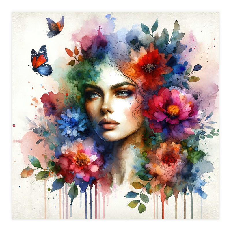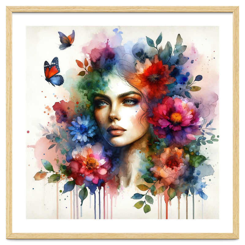 A serene portrait framed by colorful garden blossoms, soft leaves, and drifting butterflies on a clean light background. Luminous watercolor washes, subtle splashes, and clean negative space create a refined contemporary focal point.