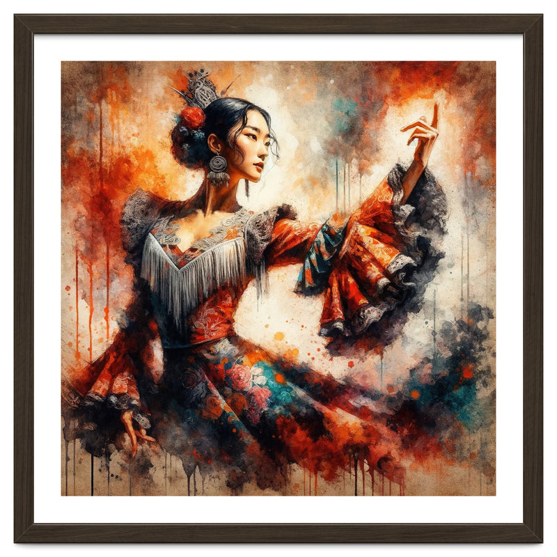 Striking flamenco dancer portrait in side view with warm reds, flowing ruffles, and expressive watercolor splashes. Clean negative space creates a refined contemporary statement for modern interiors.