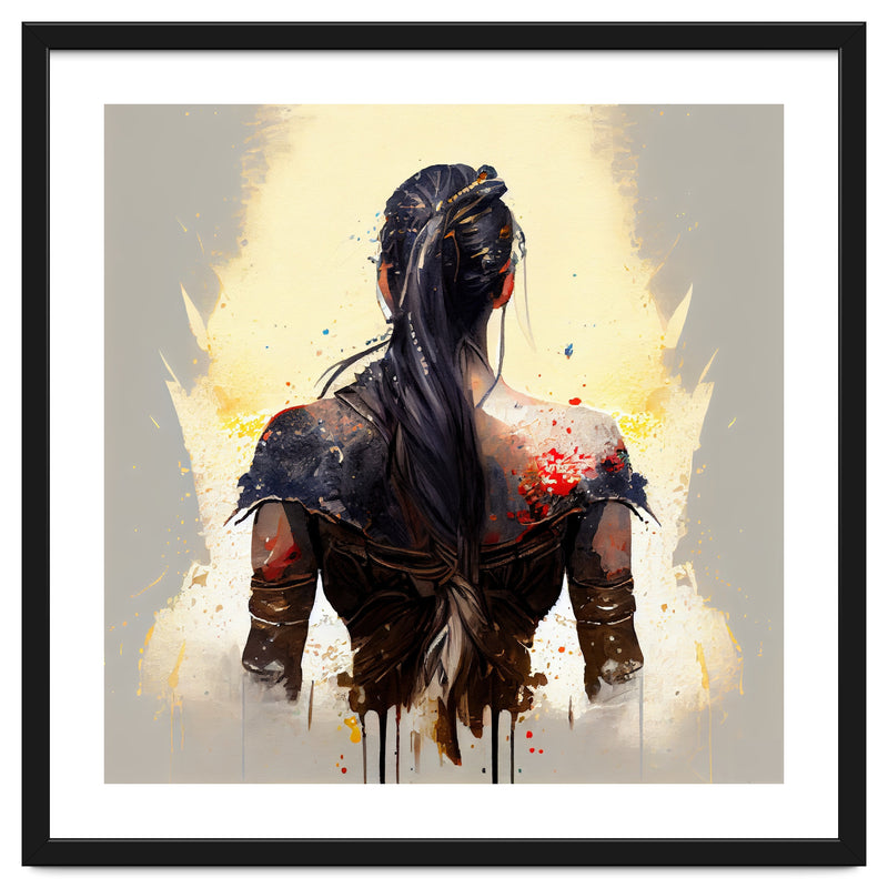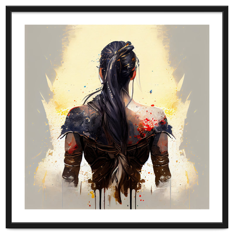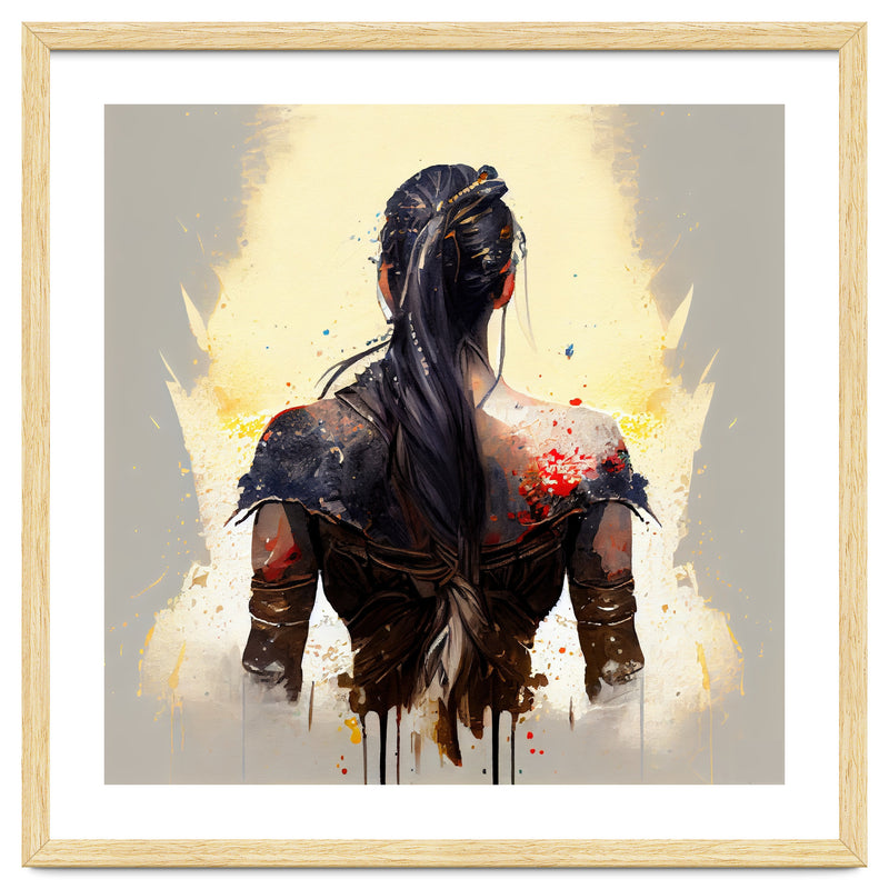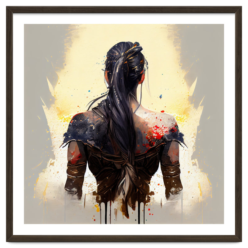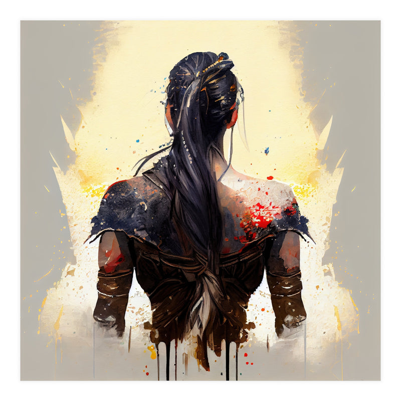 Back view warrior portrait with a long braid, leather armor details, and warm watercolor splashes on a clean minimal background for modern interiors.