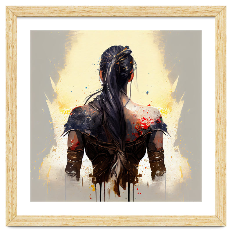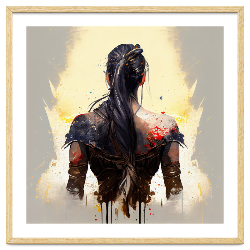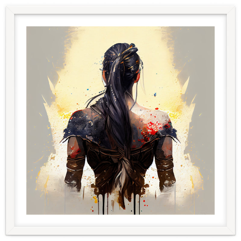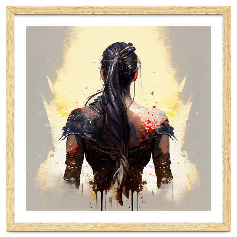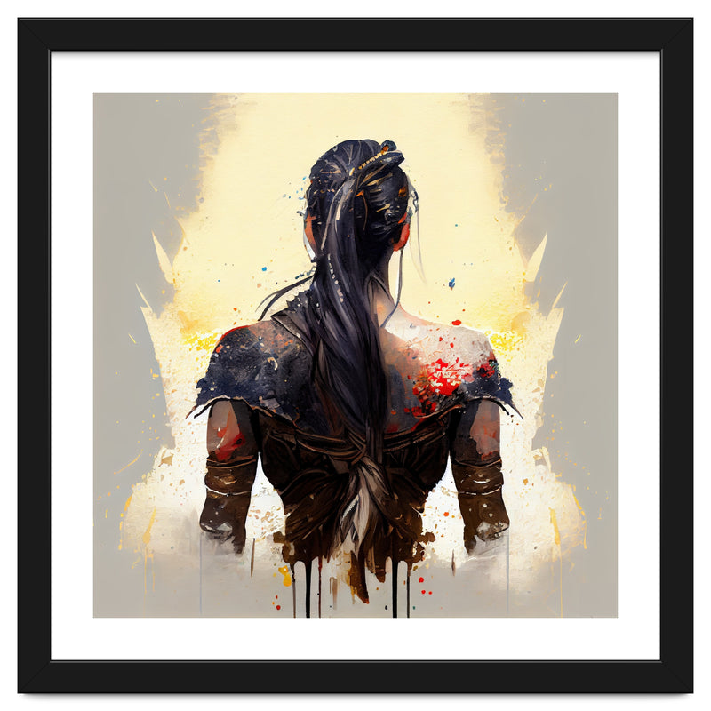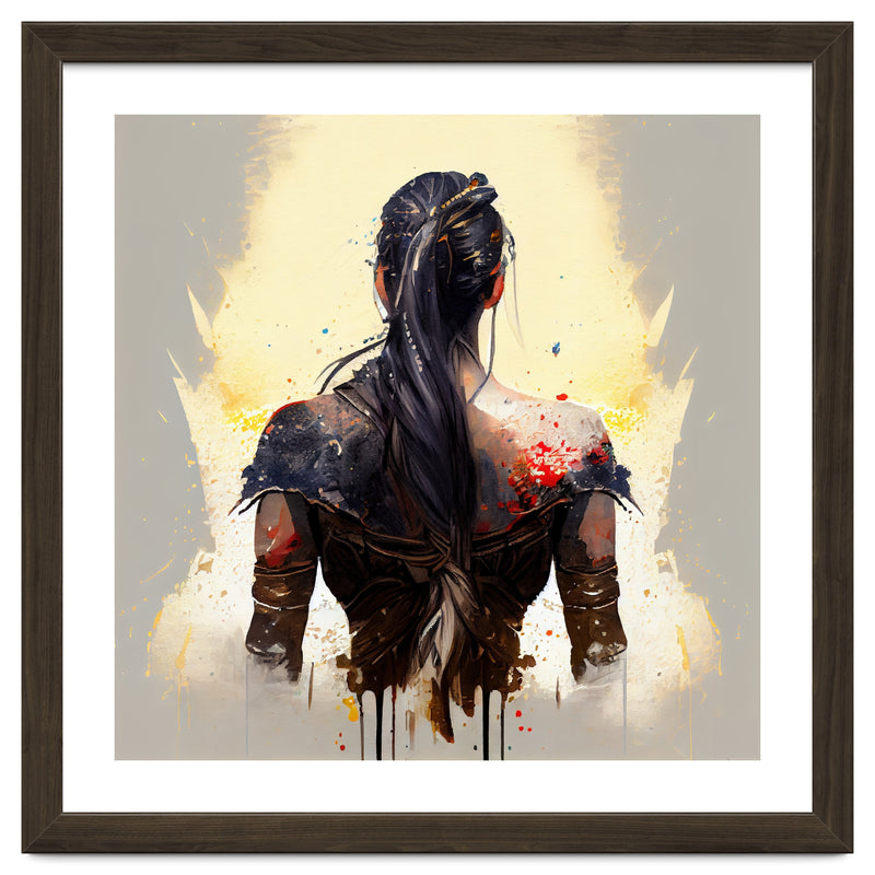 Back view warrior portrait with a long braid, leather armor details, and warm watercolor splashes on a clean minimal background for modern interiors.