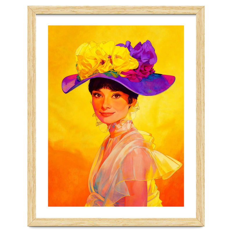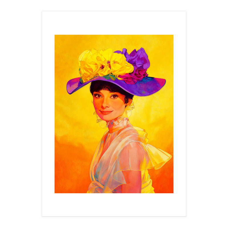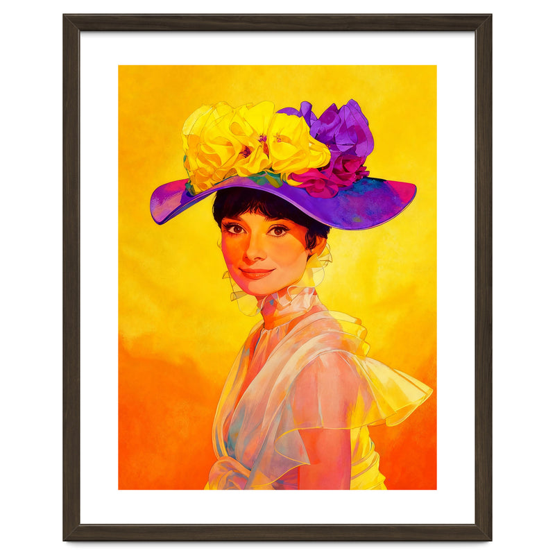 Audrey Hepburn Pop Art, Vibrant Floral Hat Portrait, Iconic Movie Star Illustration