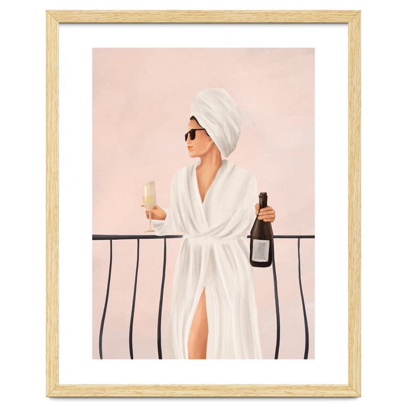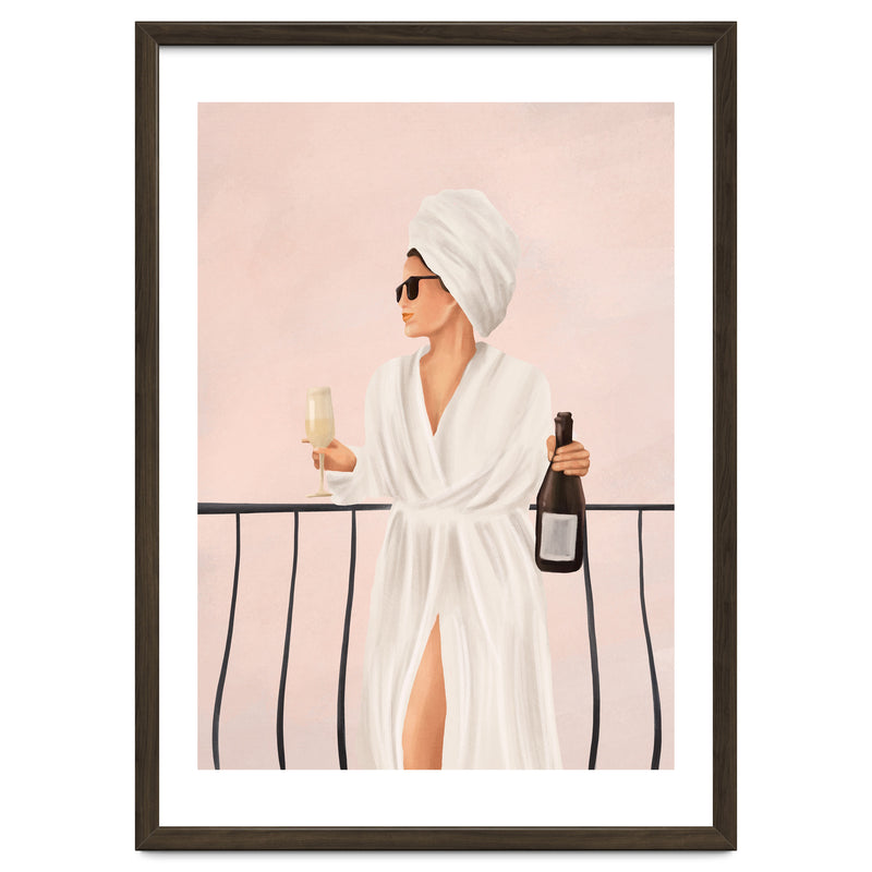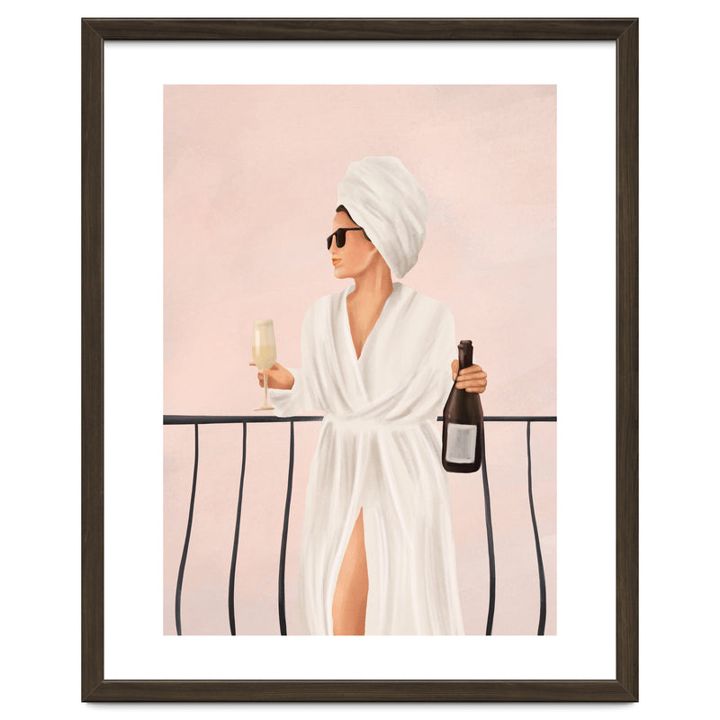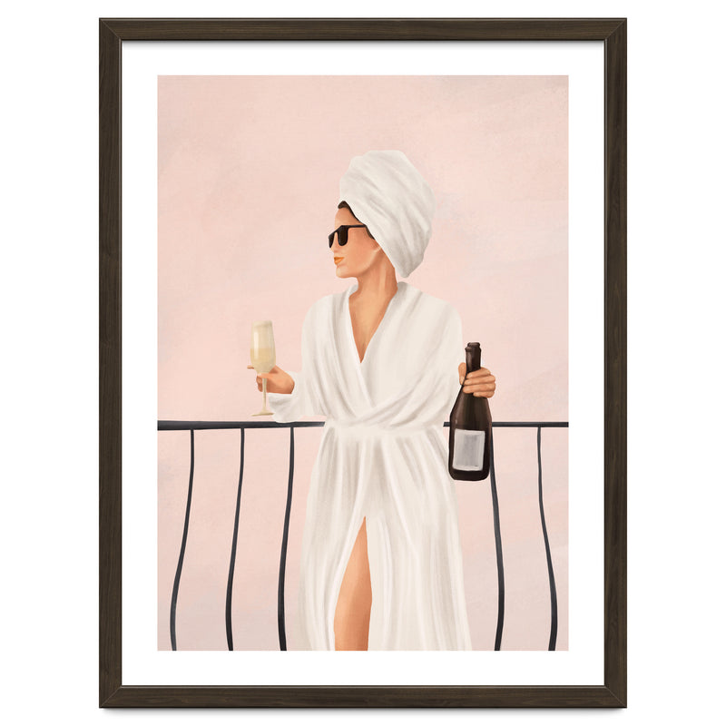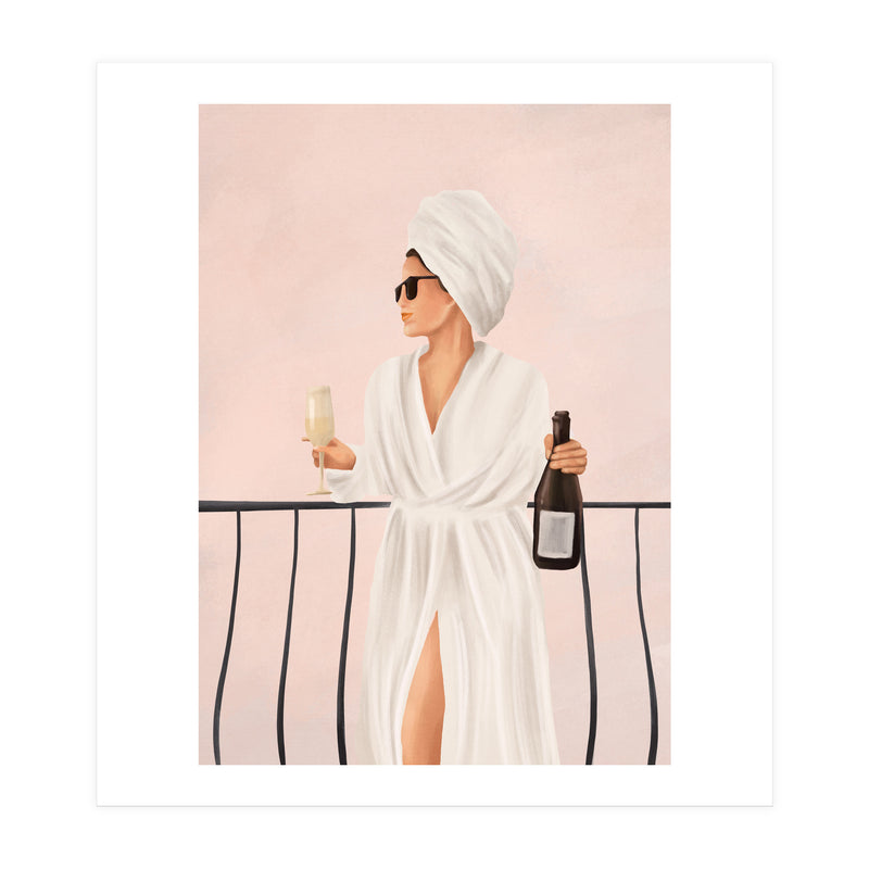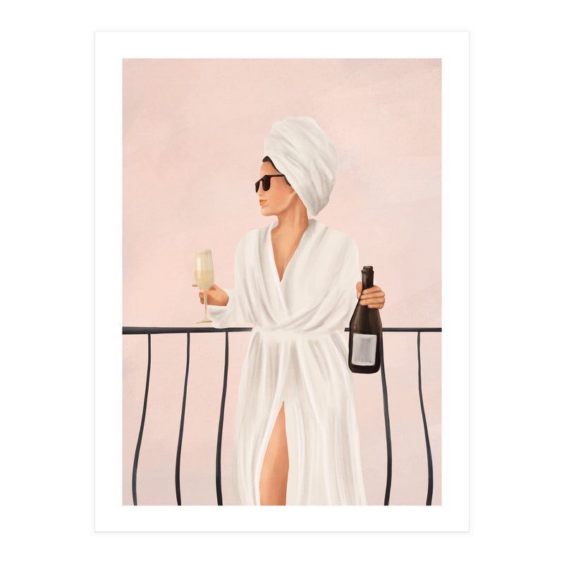 A soft, painterly illustration of a woman enjoying a morning drink on a balcony, capturing themes of calm, confidence, and understated luxury.