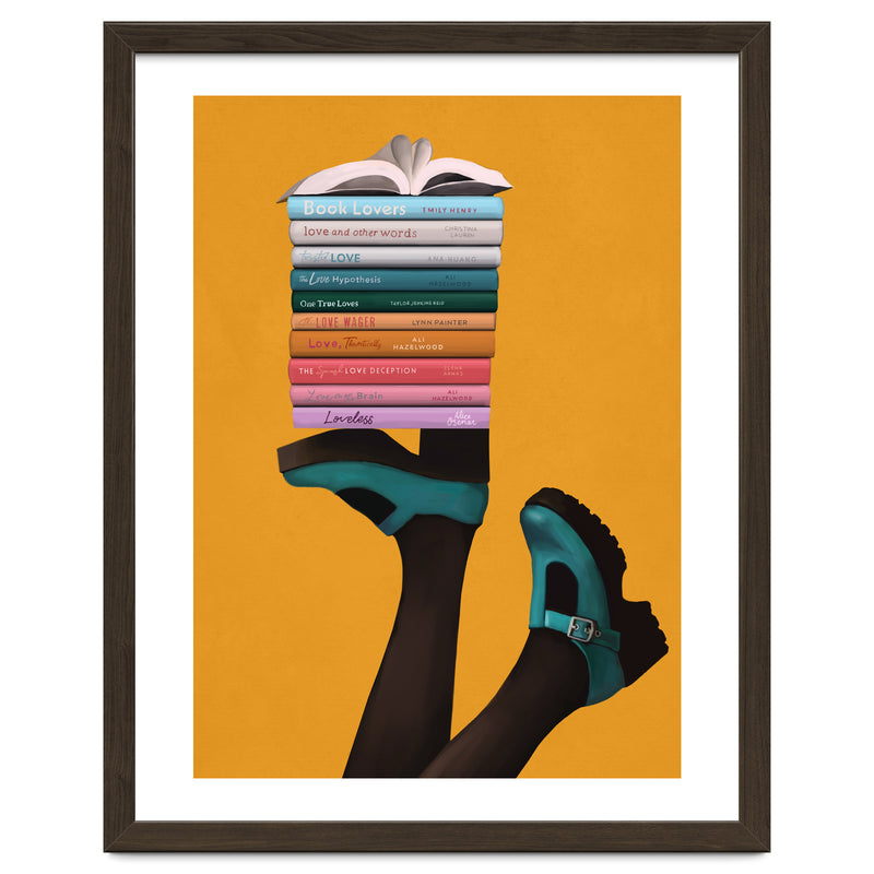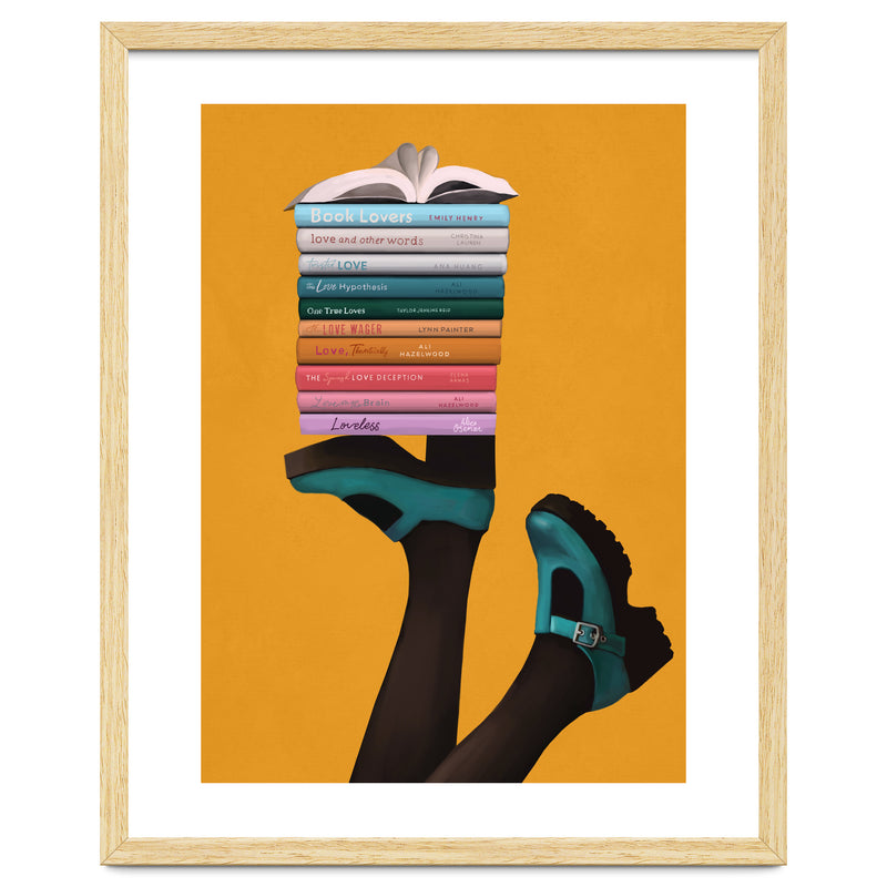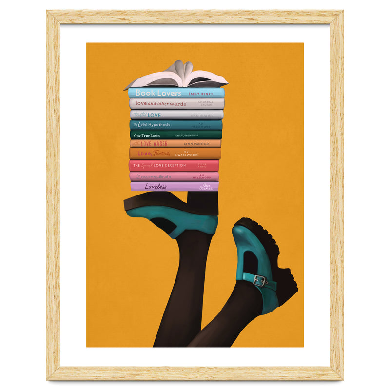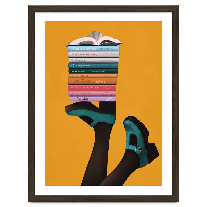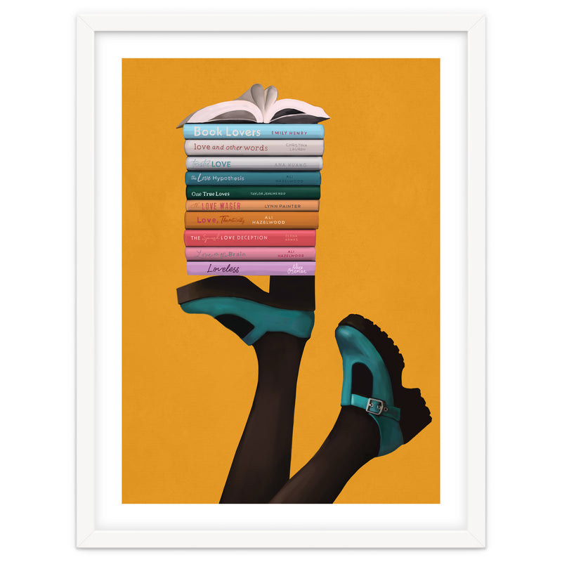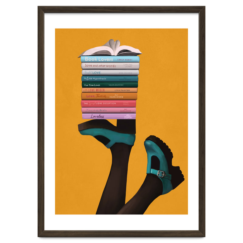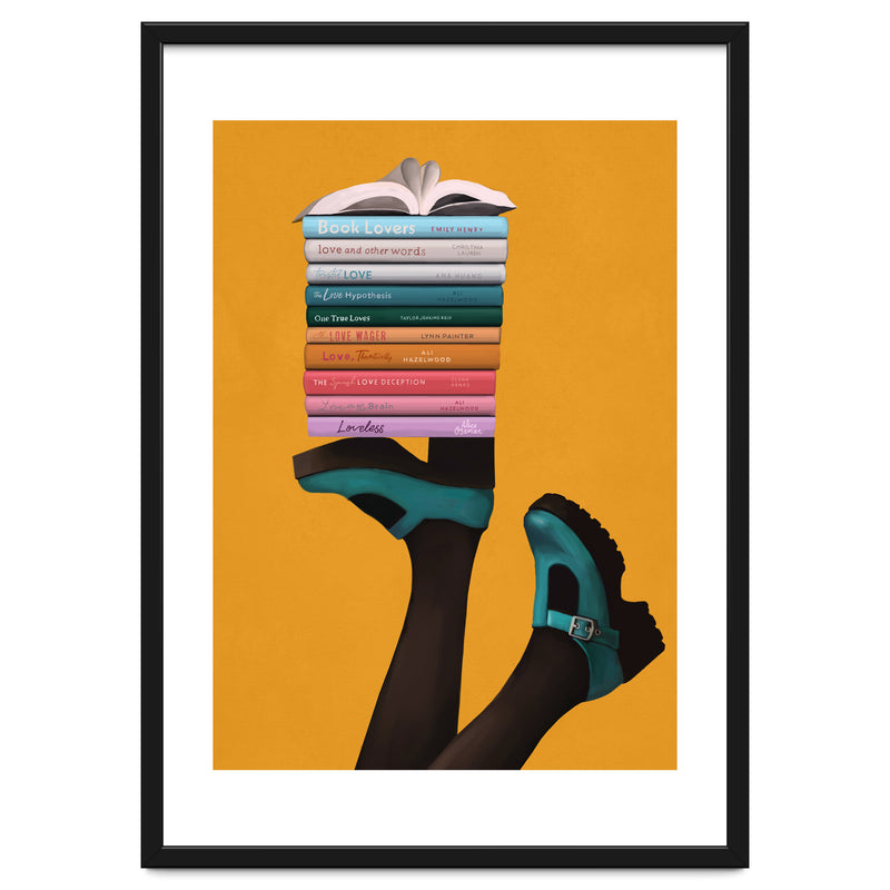 A bold, contemporary illustration of a woman’s legs lifted playfully in the air, balancing a colorful stack of romance novels. The vibrant background enhances the confident, bookish charm of the composition.
