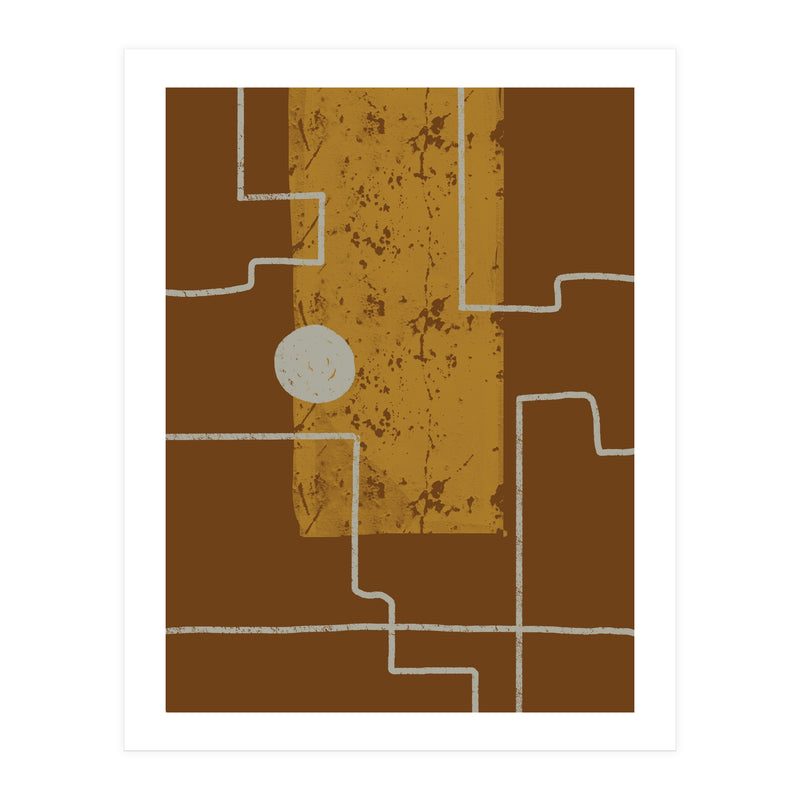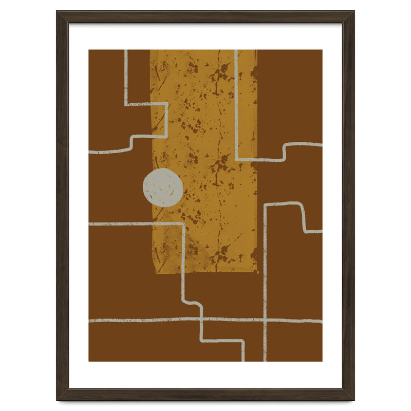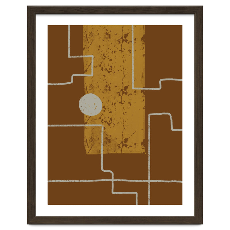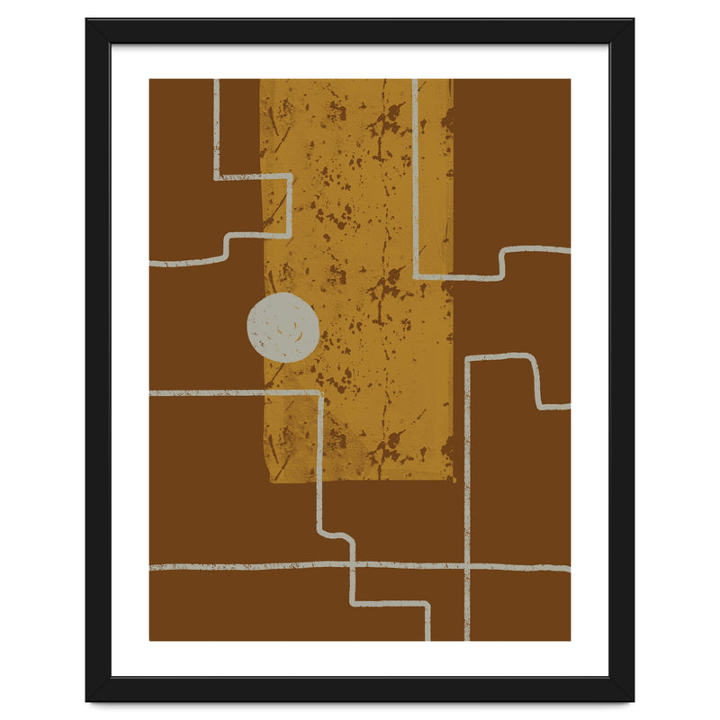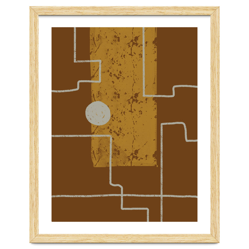A pale circle appears among geometric lines and rich earth tones, creating a mysterious atmosphere like an eclipse occurring in the midst of a barren and silent landscape.