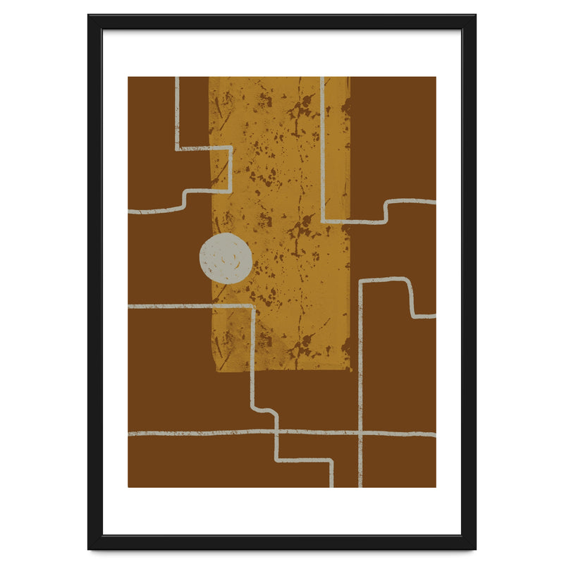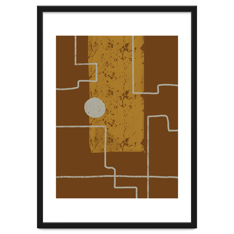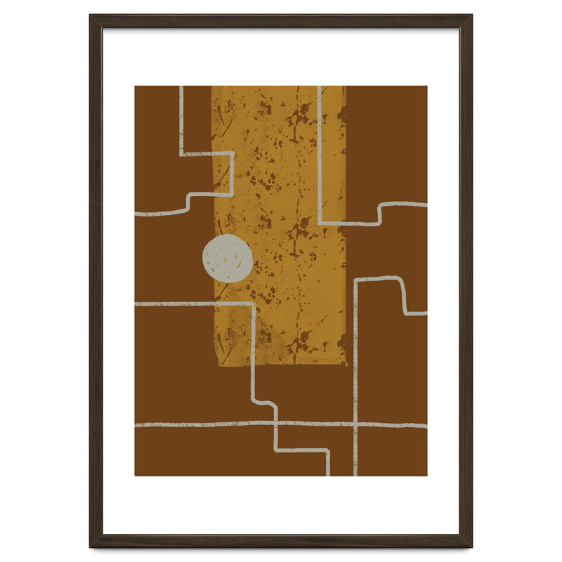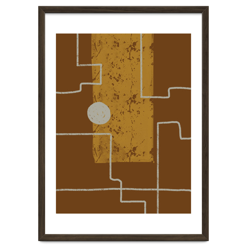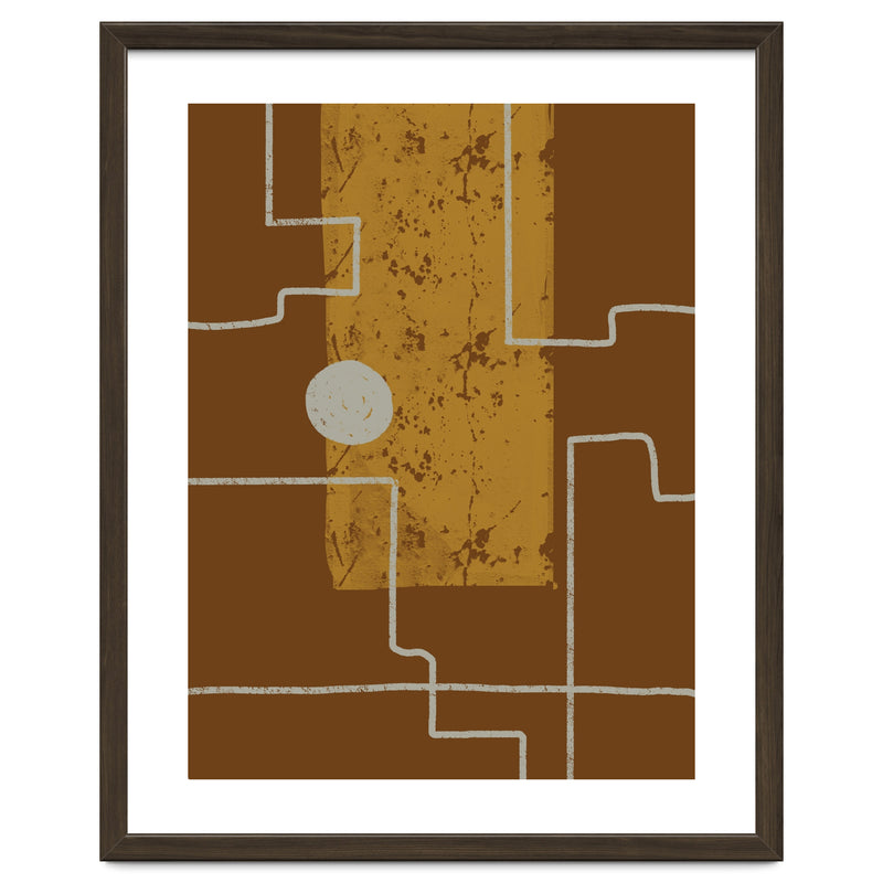 A pale circle appears among geometric lines and rich earth tones, creating a mysterious atmosphere like an eclipse occurring in the midst of a barren and silent landscape.