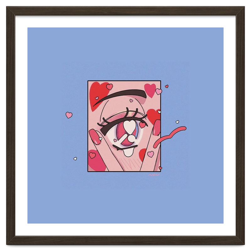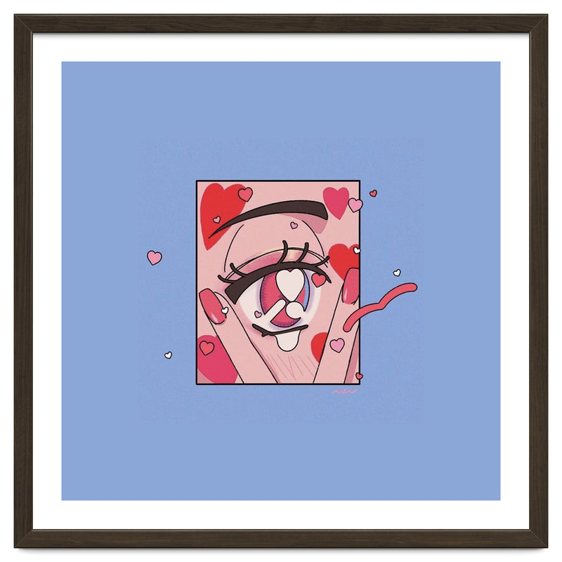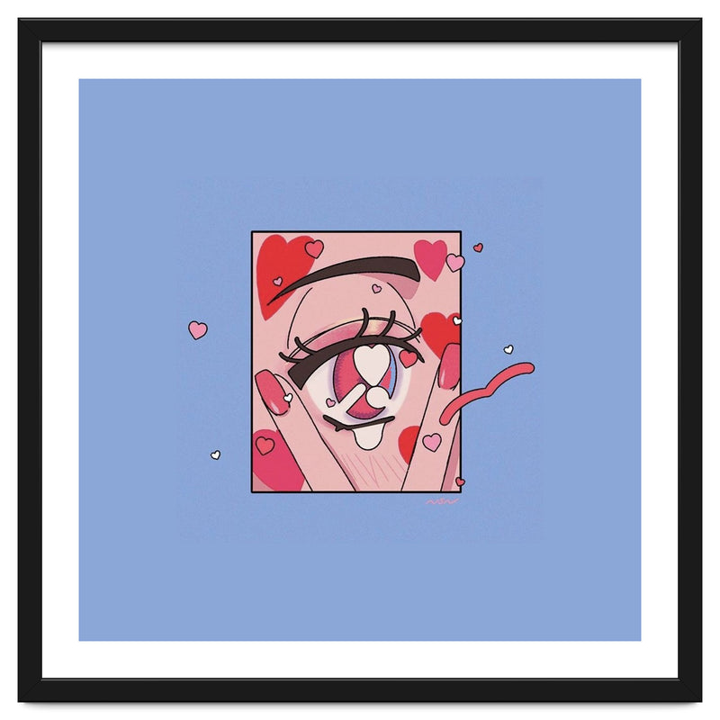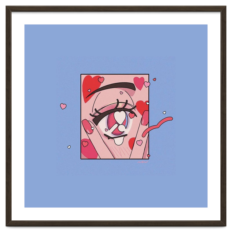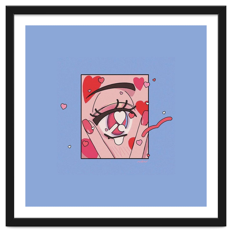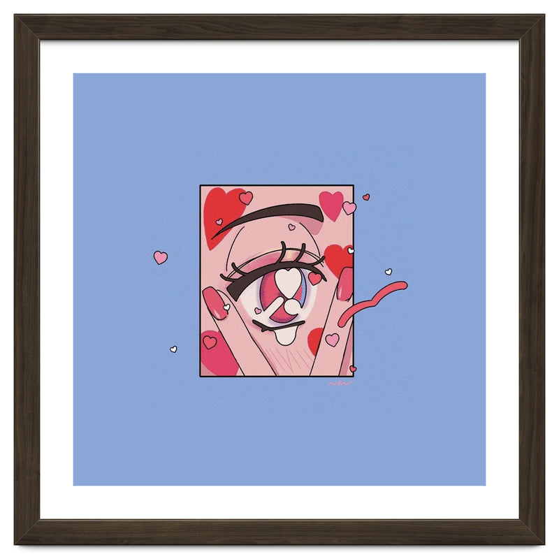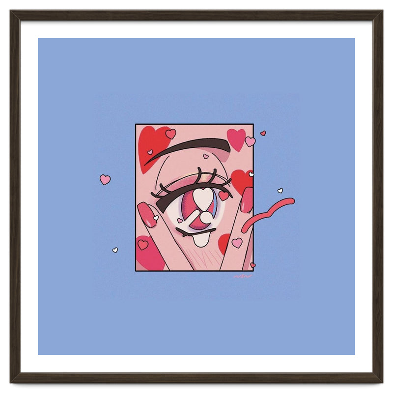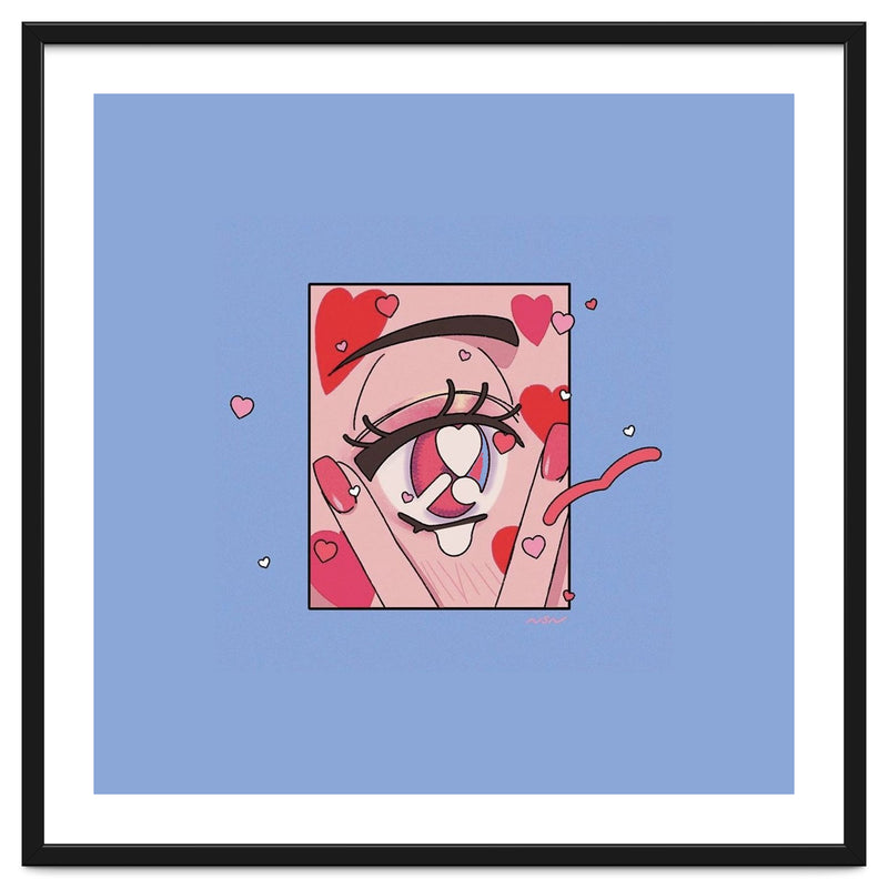 A playful and expressive digital illustration focusing on a cute eye surrounded by floating hearts. The soft pinks and reds create a whimsical, romantic atmosphere.