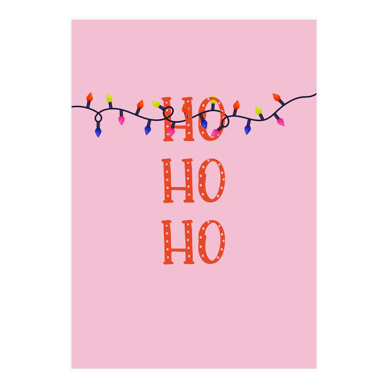 A super fun and bright illustration featuring "HO HO HO" typography and a string of colorful Christmas lights on a sweet pink background.