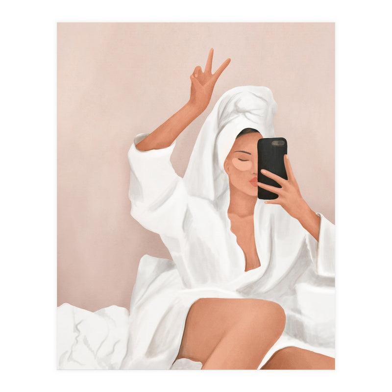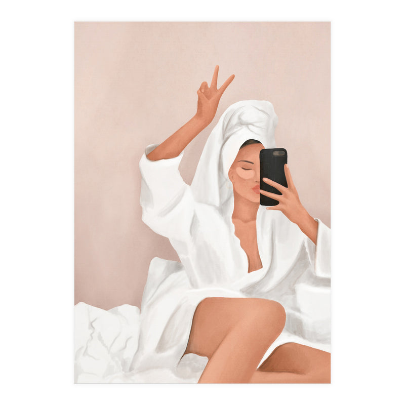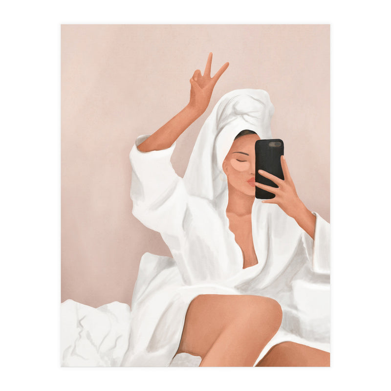 A soft, painterly illustration of a woman taking a morning selfie in a white robe, capturing themes of self-expression, ease, and contemporary stillness.