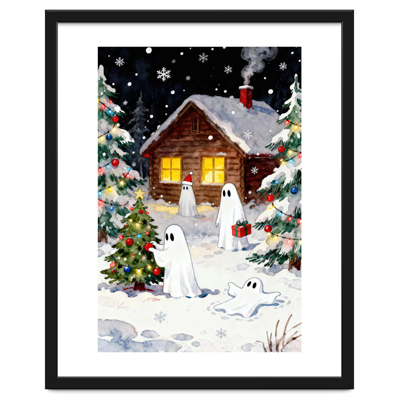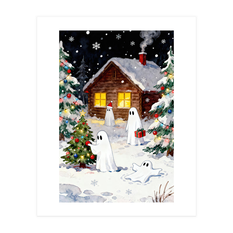 A charming winter watercolor showing friendly little ghosts celebrating Christmas under falling snow. They decorate trees with glowing ornaments, exchange gifts, and play joyfully outside a cozy wooden cabin.