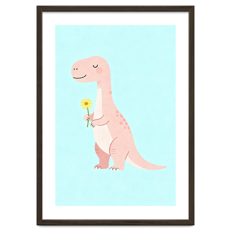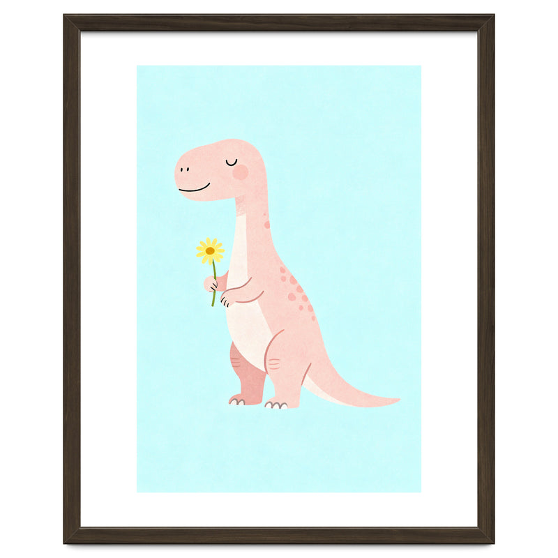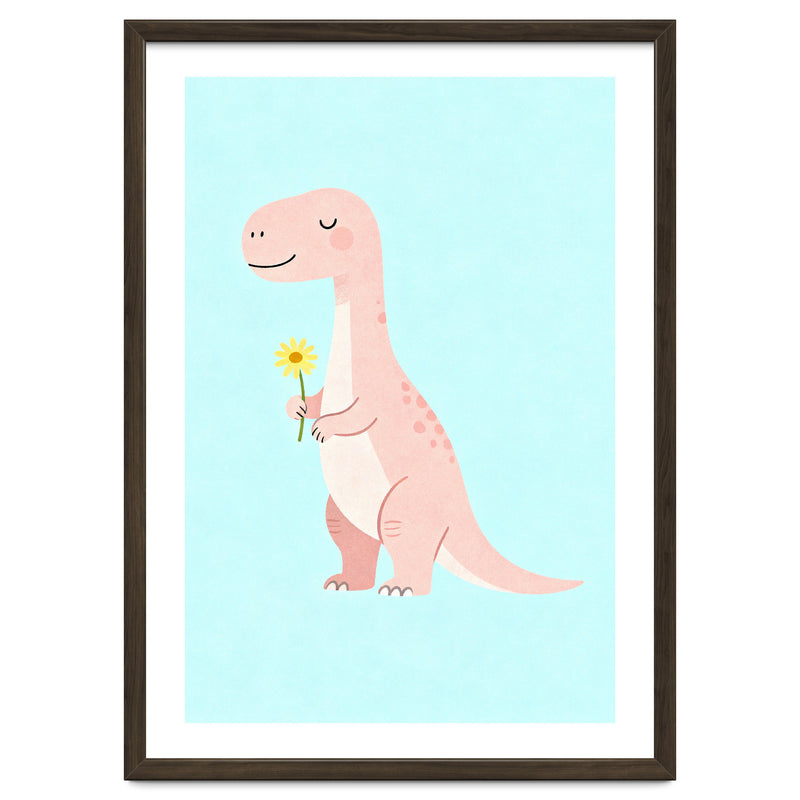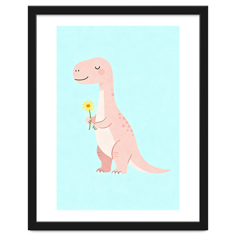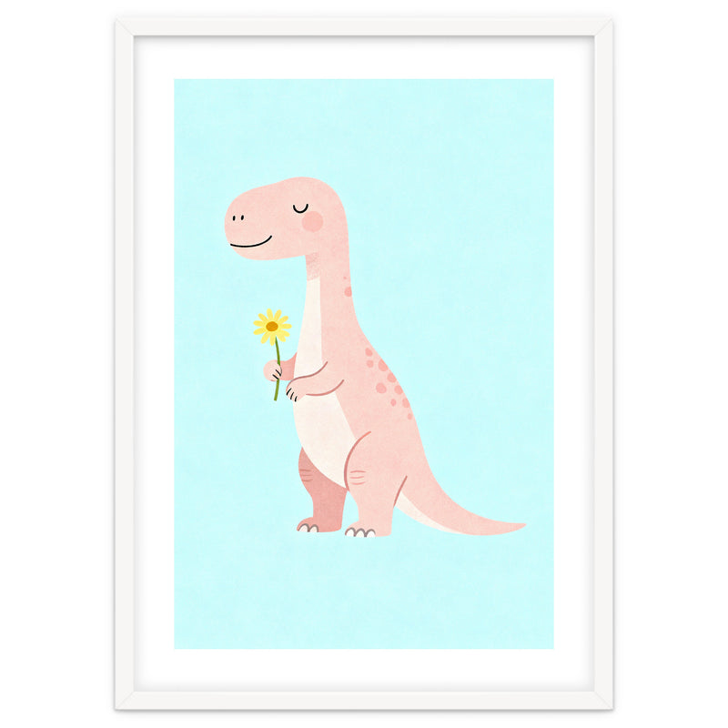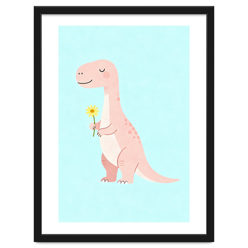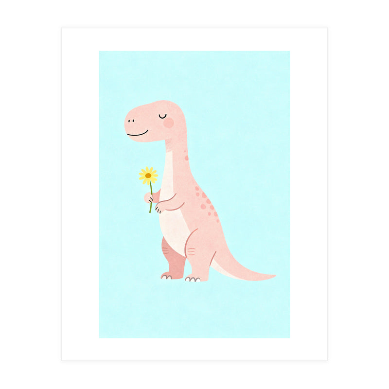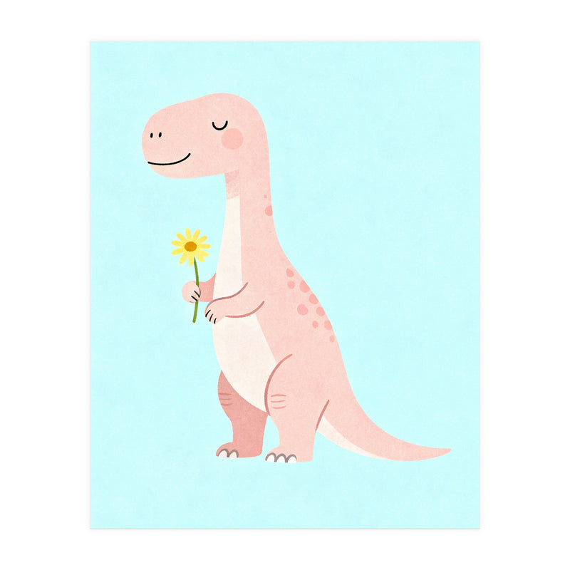 T-Rex Tyrannosaurus Dinosaur Art, Whimsical Dino with Flower, Gentle Nursery Print