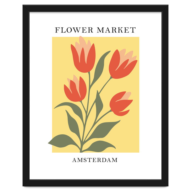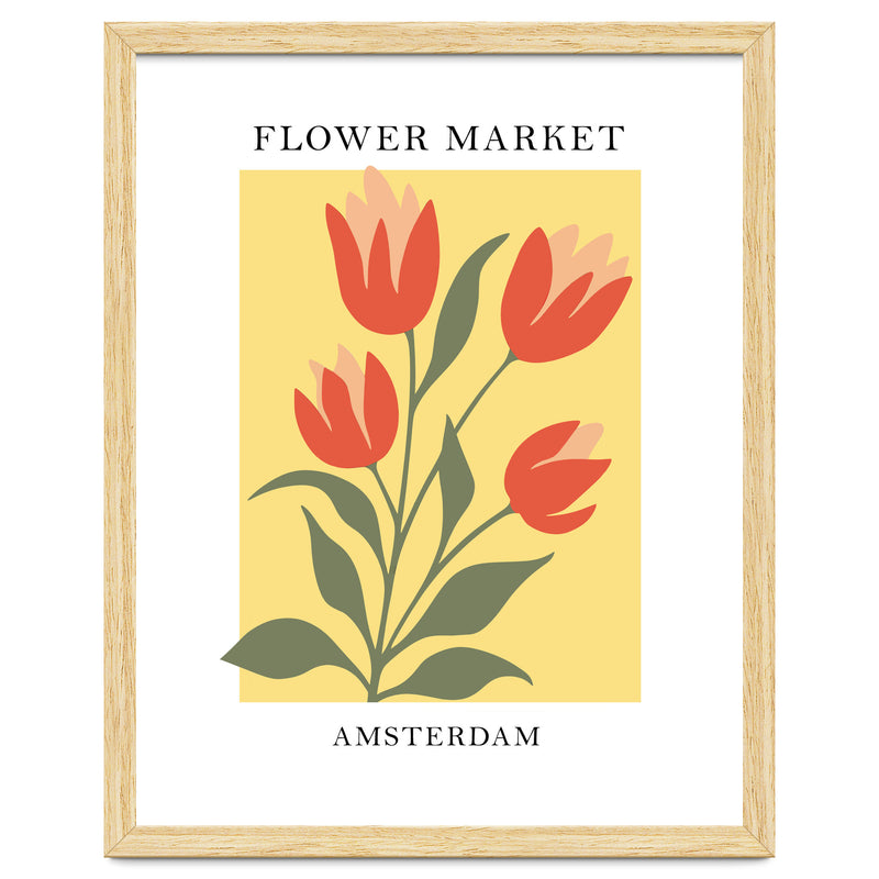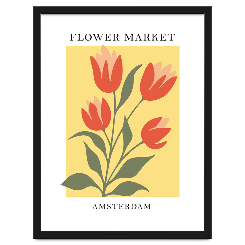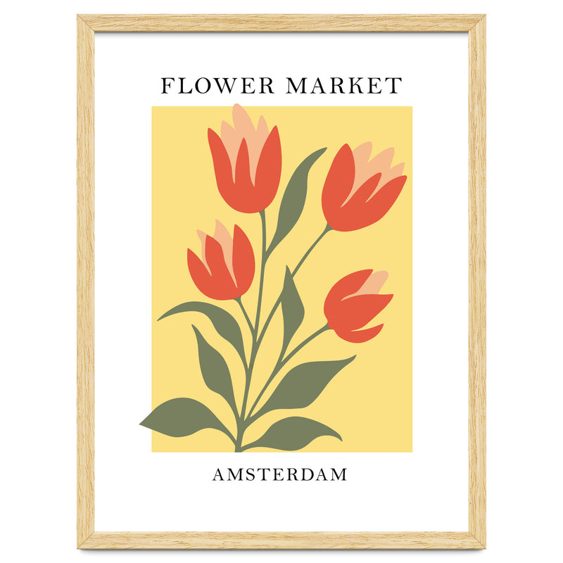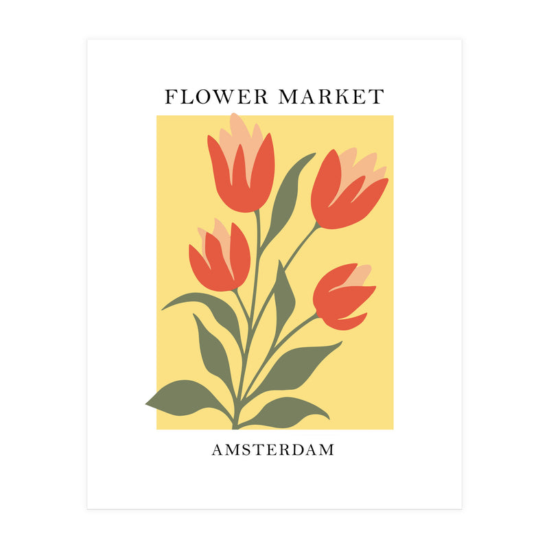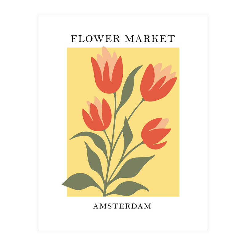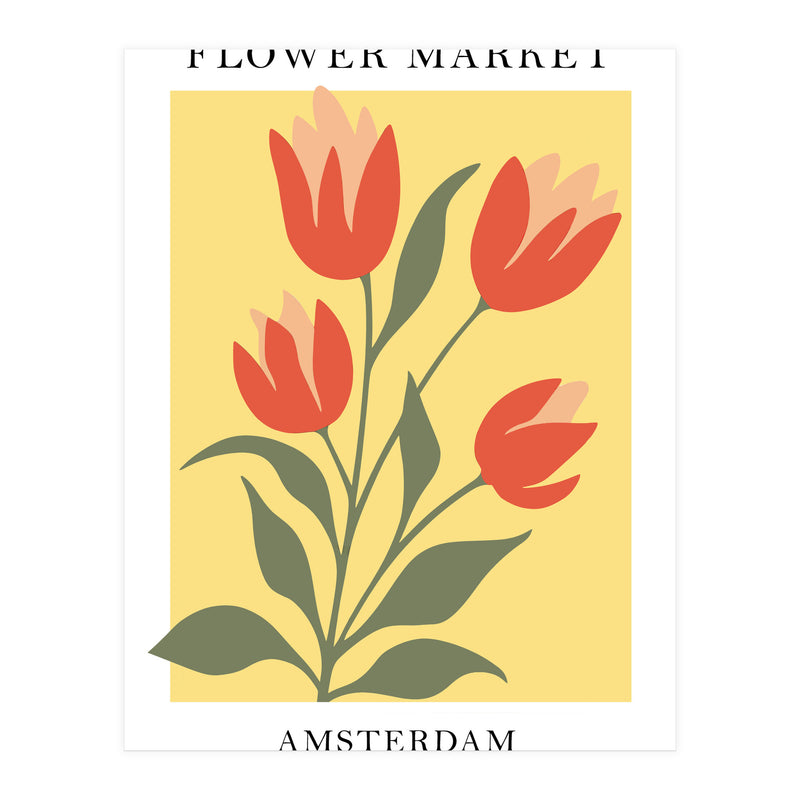 This vibrant print, titled "Amsterdam Flower Market," captures the cheerful essence of the city's famous floral heritage. Featuring a modern, stylized illustration of iconic tulips, the artwork uses a warm color palette of deep reds and soft pinks against a sunny yellow background.