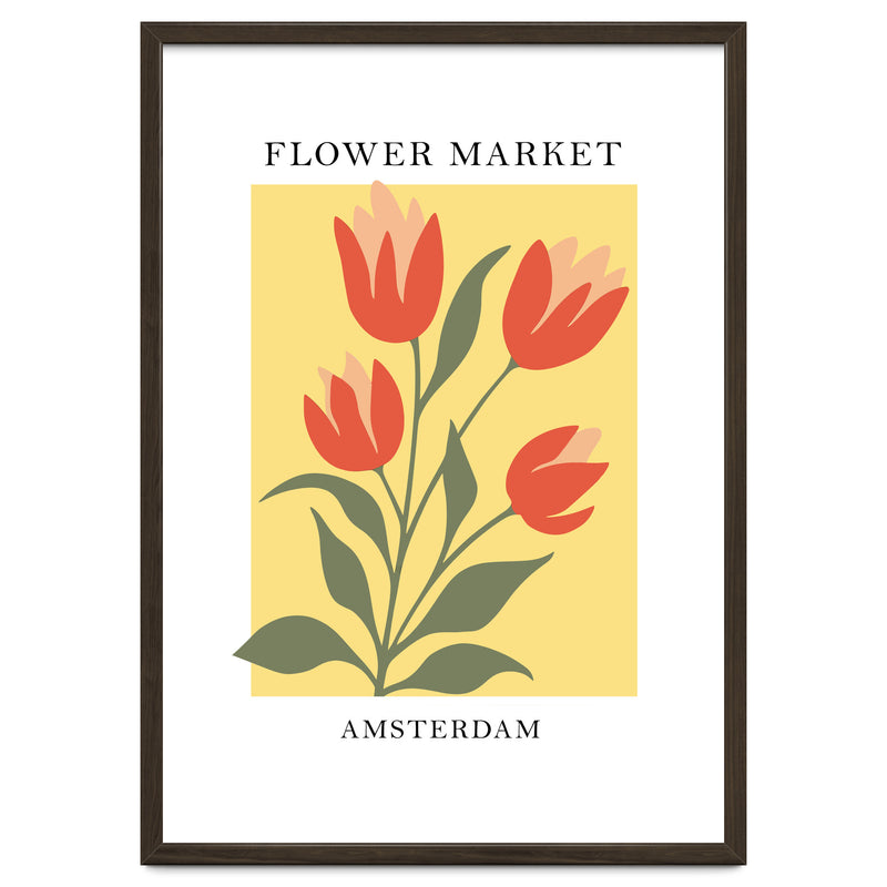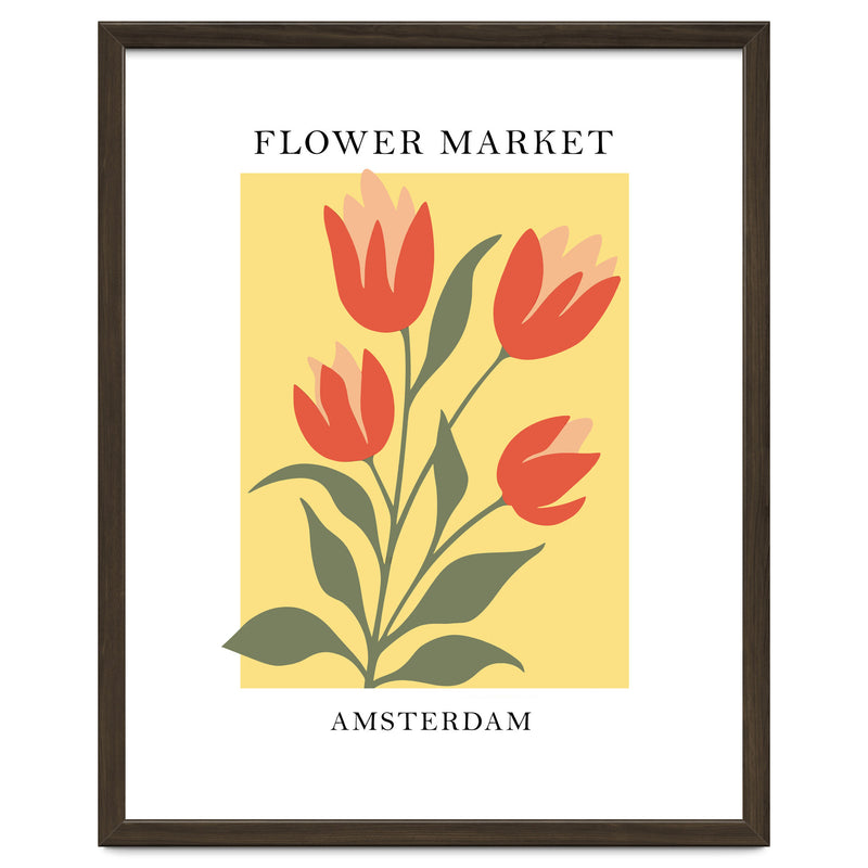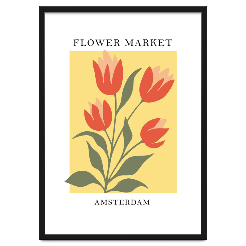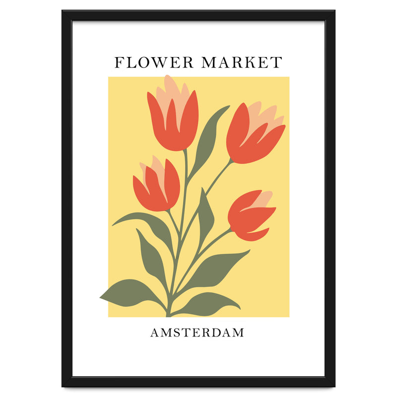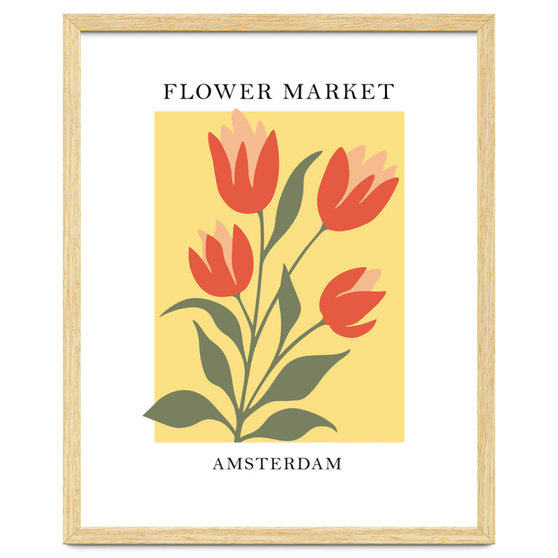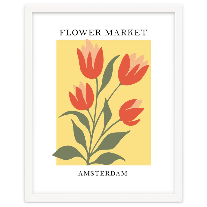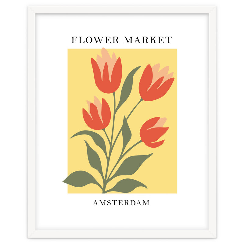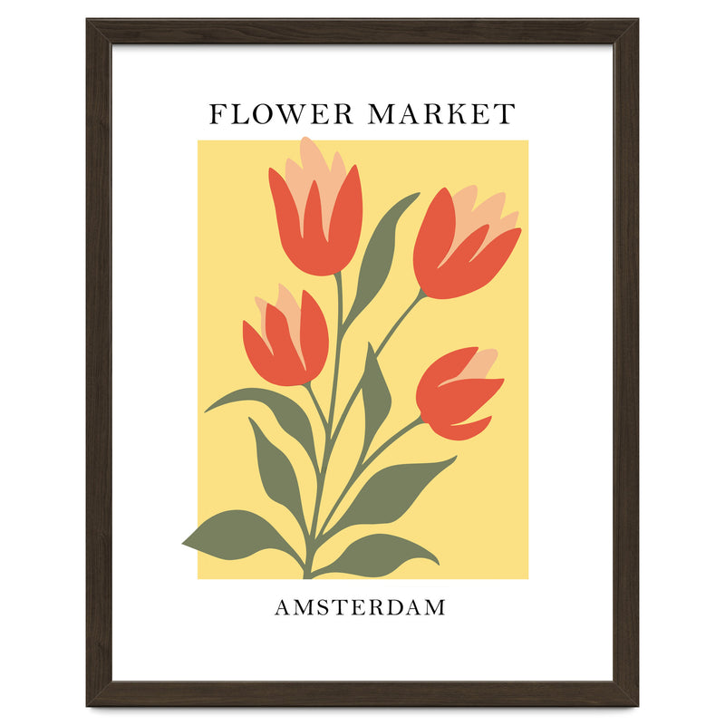 This vibrant print, titled "Amsterdam Flower Market," captures the cheerful essence of the city's famous floral heritage. Featuring a modern, stylized illustration of iconic tulips, the artwork uses a warm color palette of deep reds and soft pinks against a sunny yellow background.