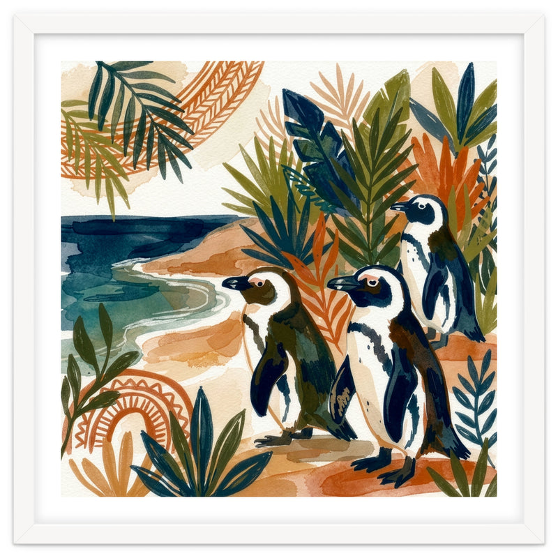 A captivating painting that captures a serene beach scene with playful penguins amidst lush tropical vegetation. Perfect for adding a touch of nature, this painting brings the beauty of the sea into your home.