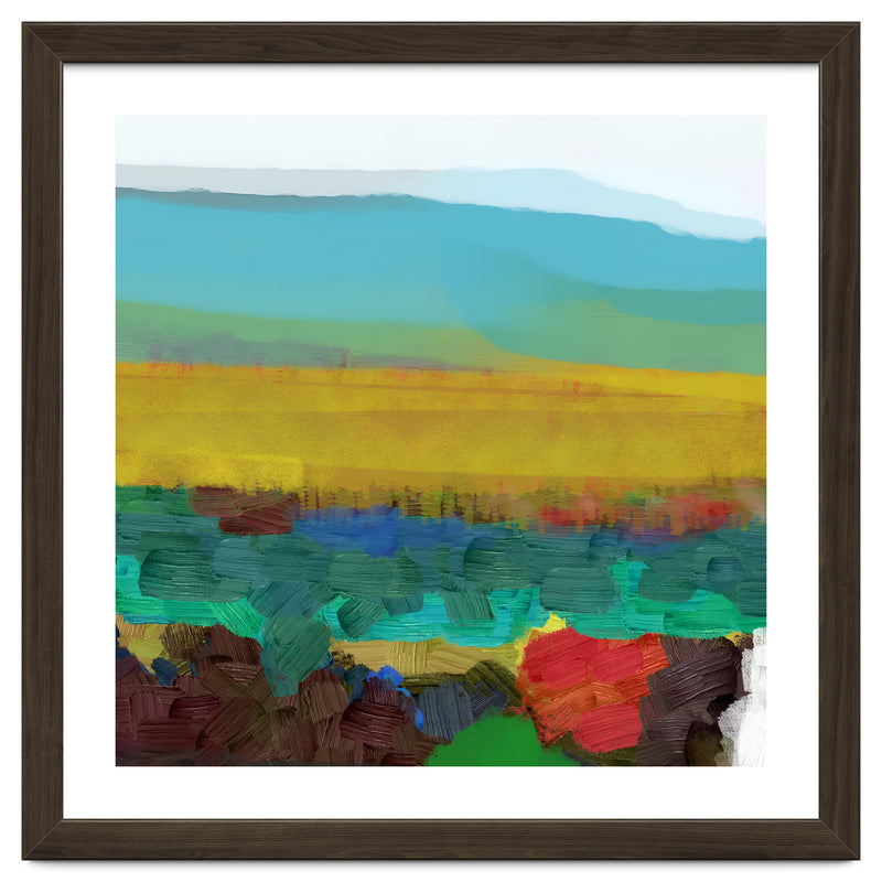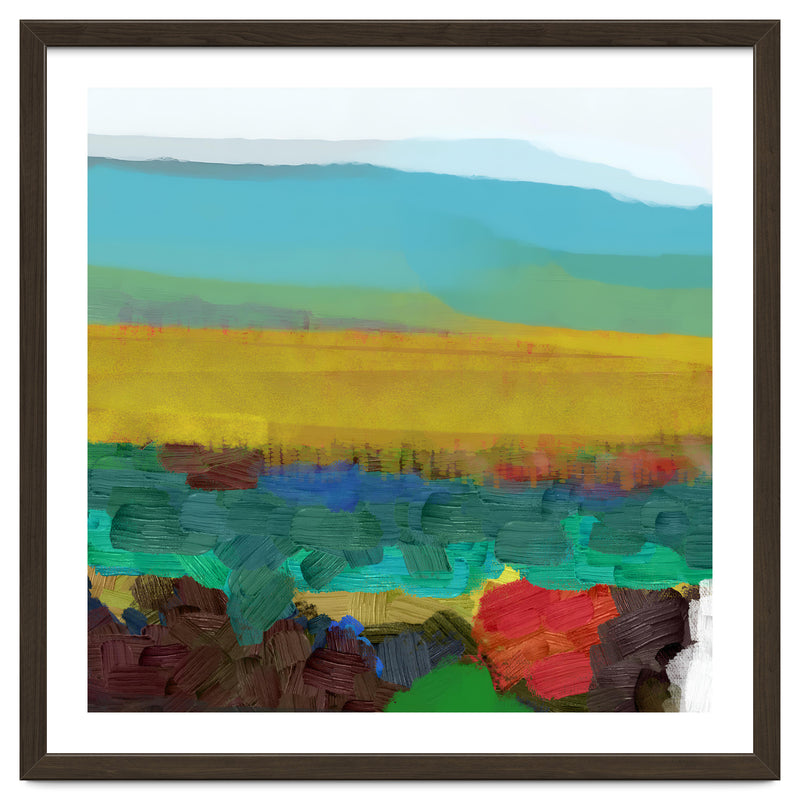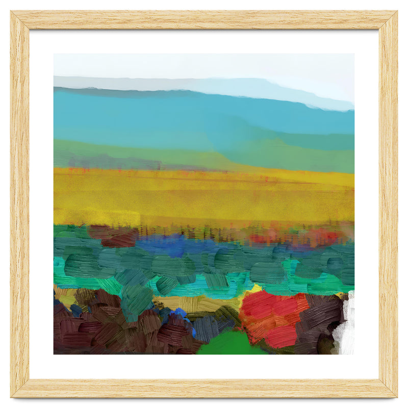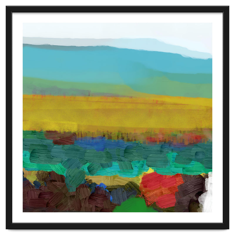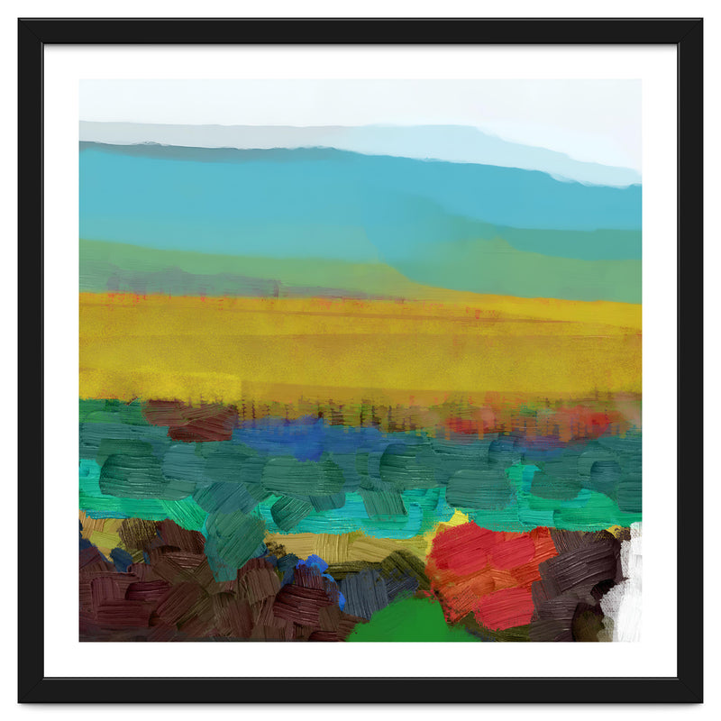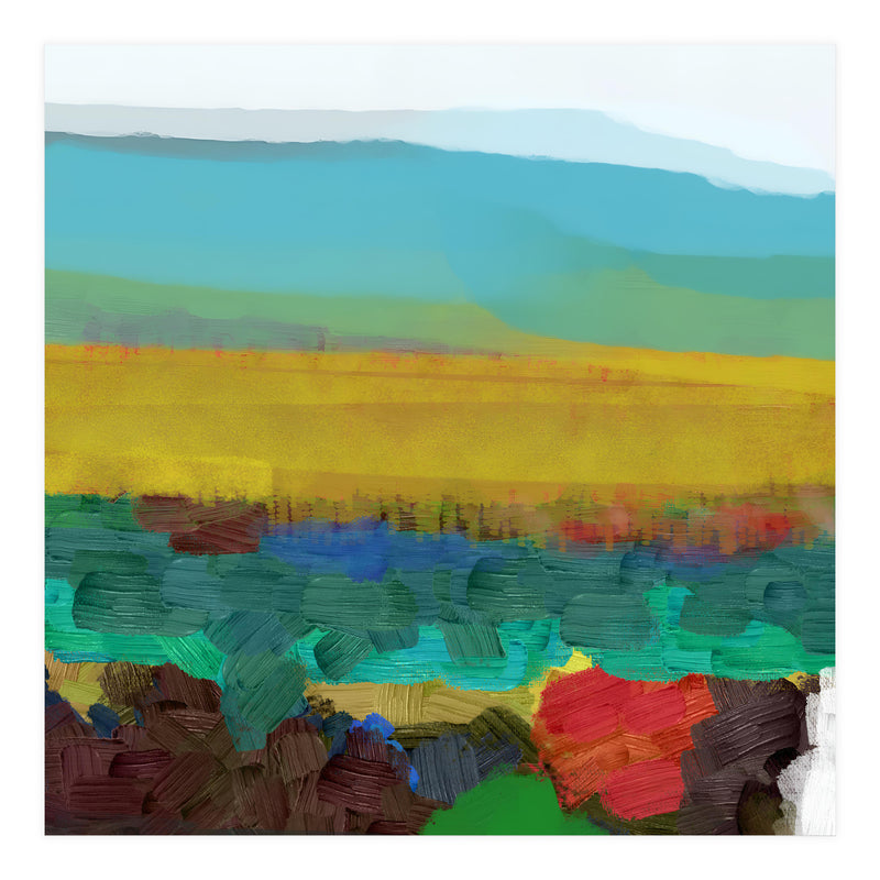 This piece uses broad, thick brushstrokes to create a highly textured, expressive landscape. The intense jewel tones of the foreground (deep red, blue, green) create a powerful visual contrast with the wide, atmospheric yellow field and the soft, cool sky above.