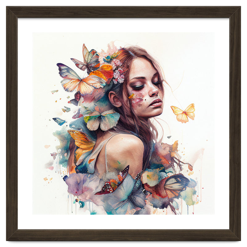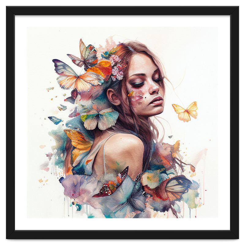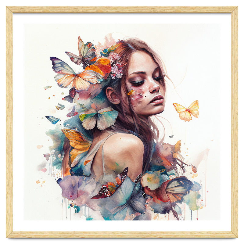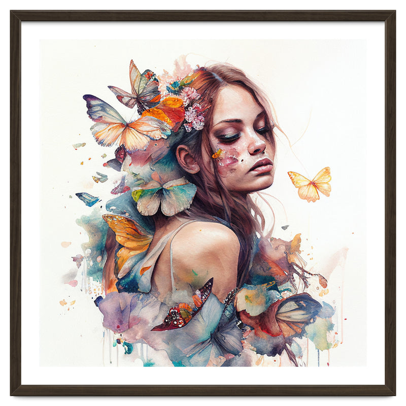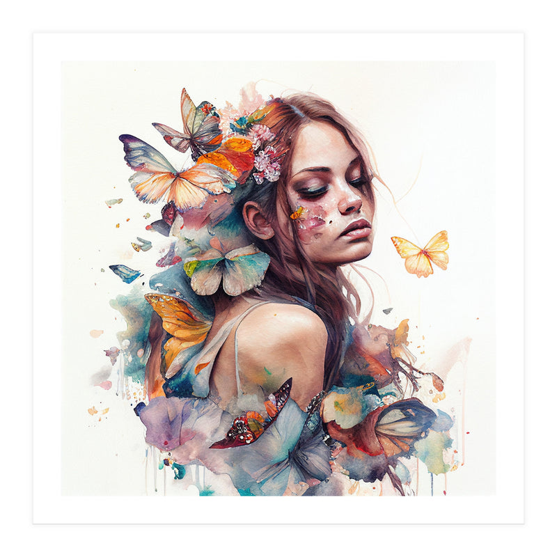 Close up watercolor portrait of a woman in soft three quarter view surrounded by butterflies and airy petals. Warm corals and ambers move through the wings while cool teals and violets balance the background. Transparent washes reveal paper texture and fine lines keep the gaze crisp, creating a refined contemporary focal point for modern interiors.