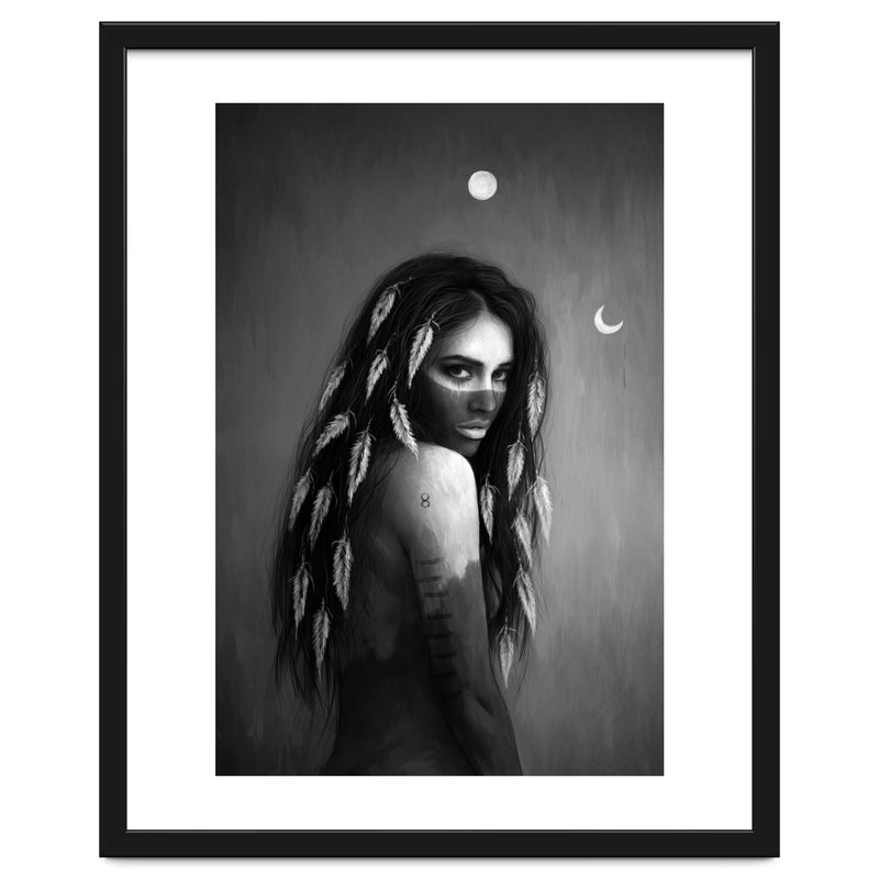 Black and white portrait of a woman with white feathers tied into her long dark hair.