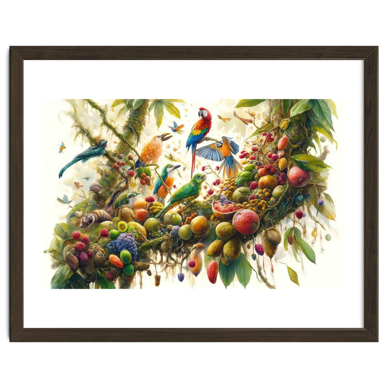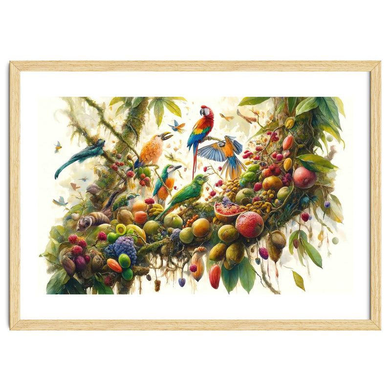 A vibrant gathering of tropical birds perched on a mossy jungle branch, surrounded by lush foliage, butterflies, and exotic fruit. Jewel like colors and airy splatter accents create a lively, uplifting focal point that works beautifully as statement wall art for modern interiors and nature inspired spaces.
