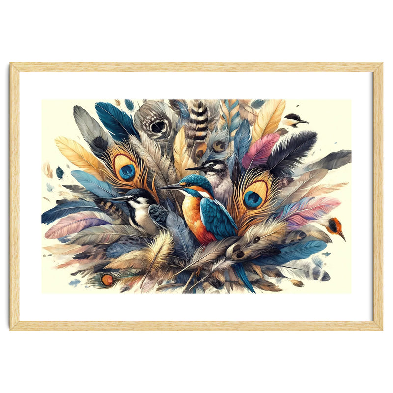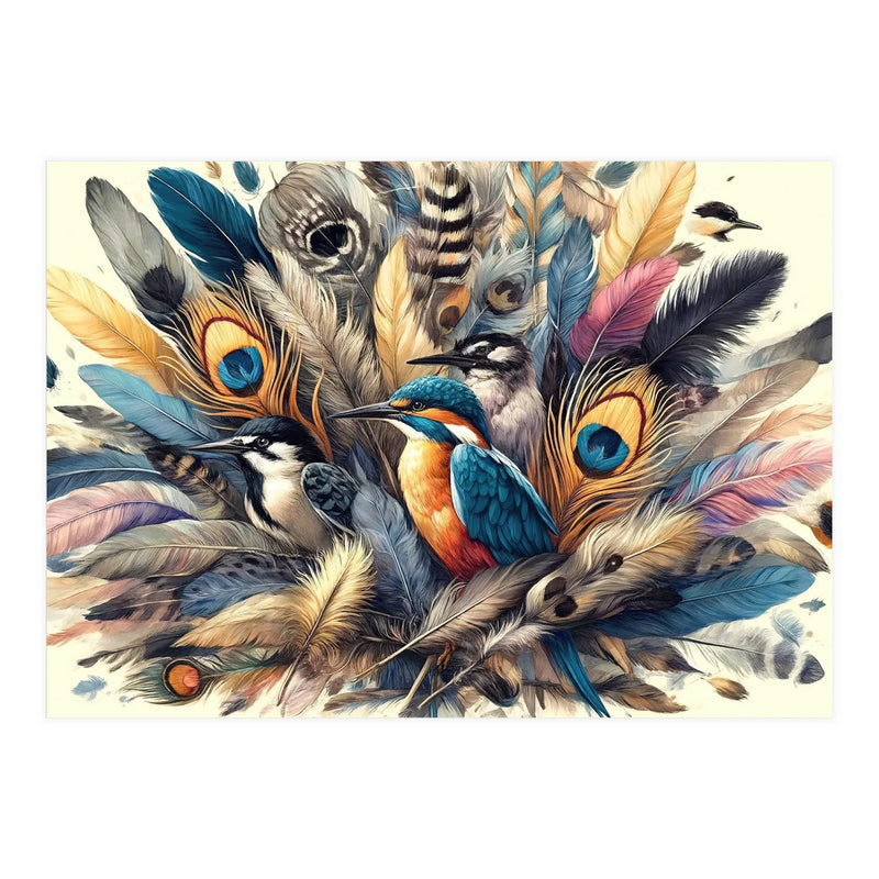 A vibrant kingfisher and delicate songbirds set among layered peacock feathers, with teal highlights, subtle eye patterns, and a clean airy background. A refined wildlife statement for contemporary interiors.